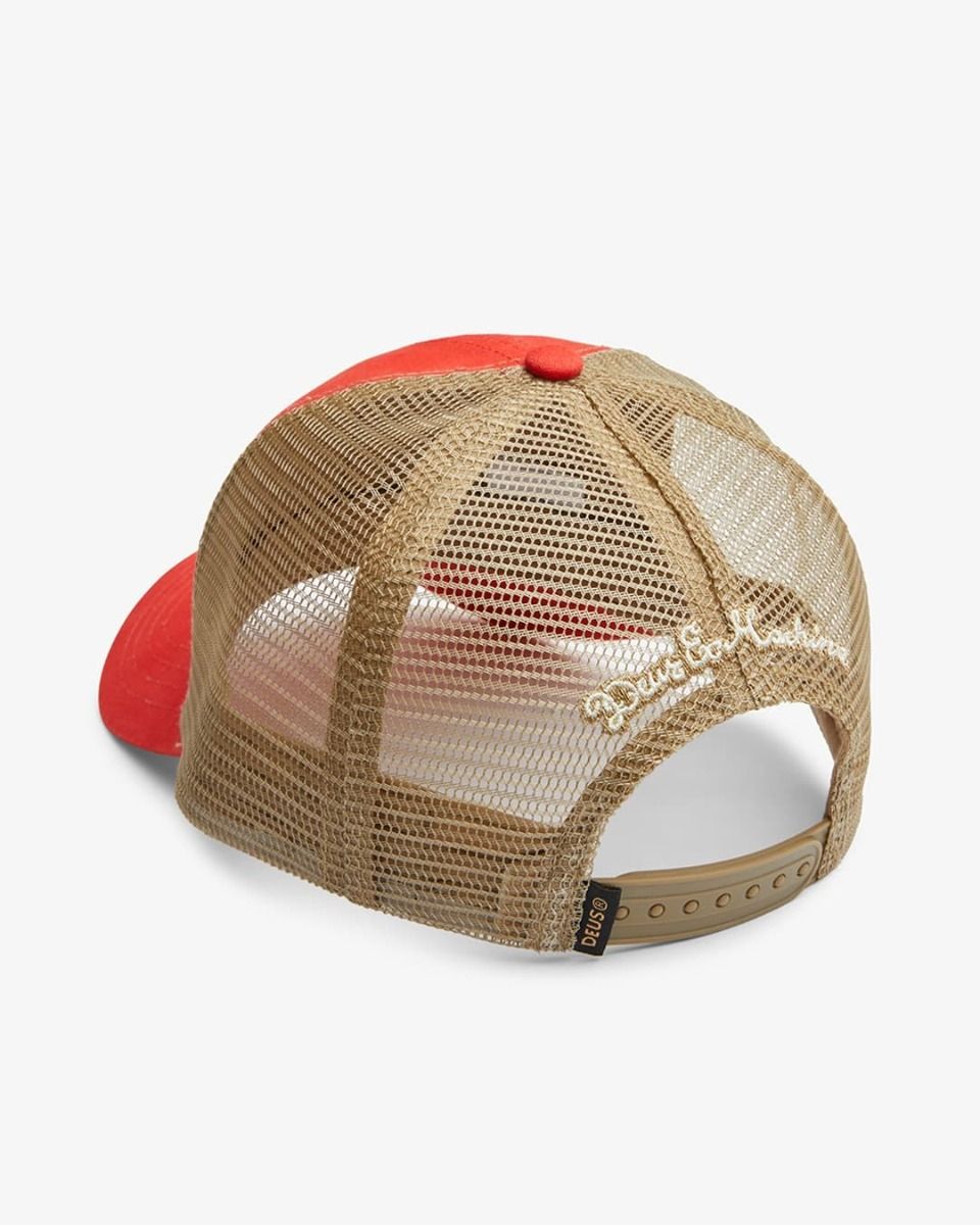 La gorra para hombre Polar Trucker en rojo (Red Clay) de Deus Ex Machina está confeccionada con lona de algodón y malla de nailon.