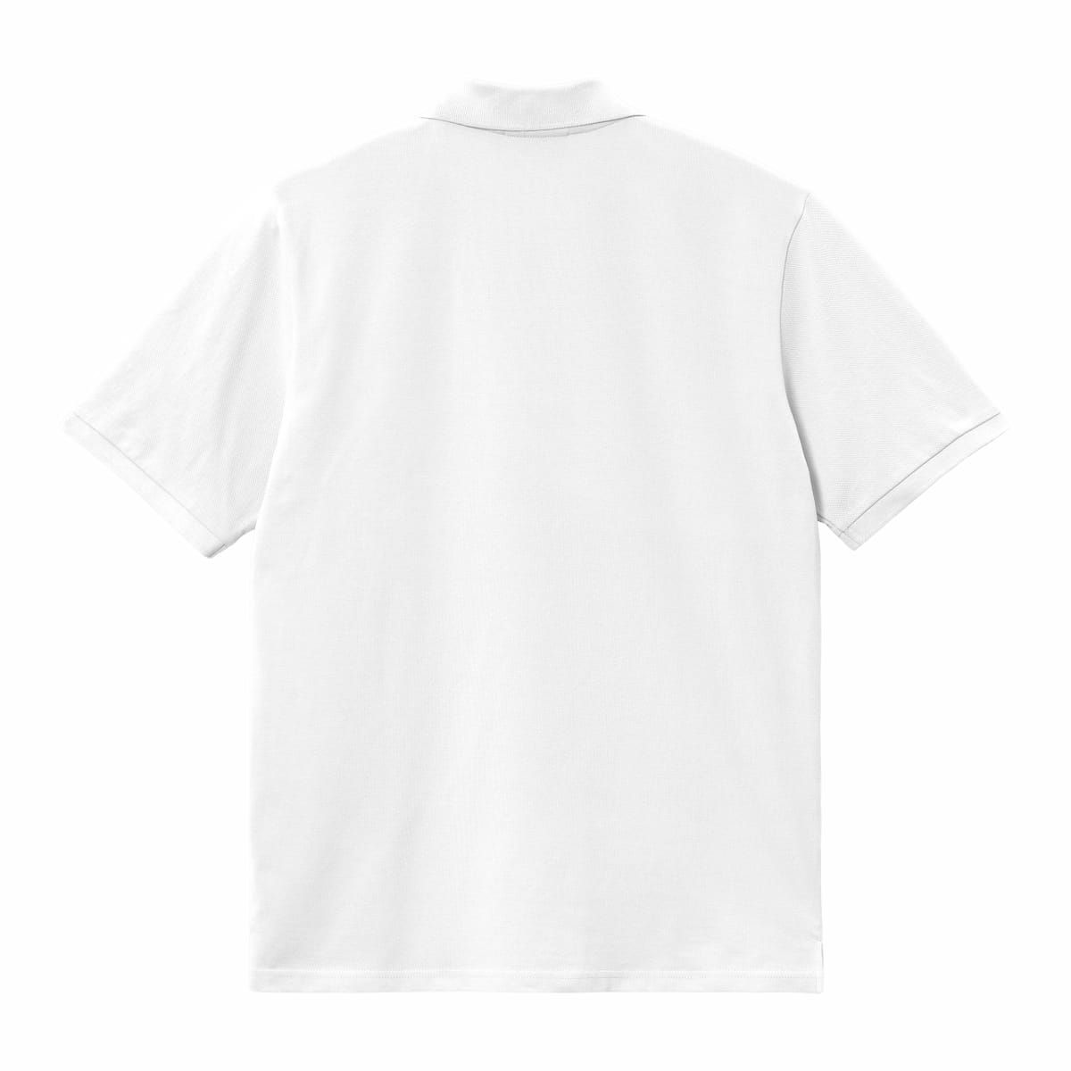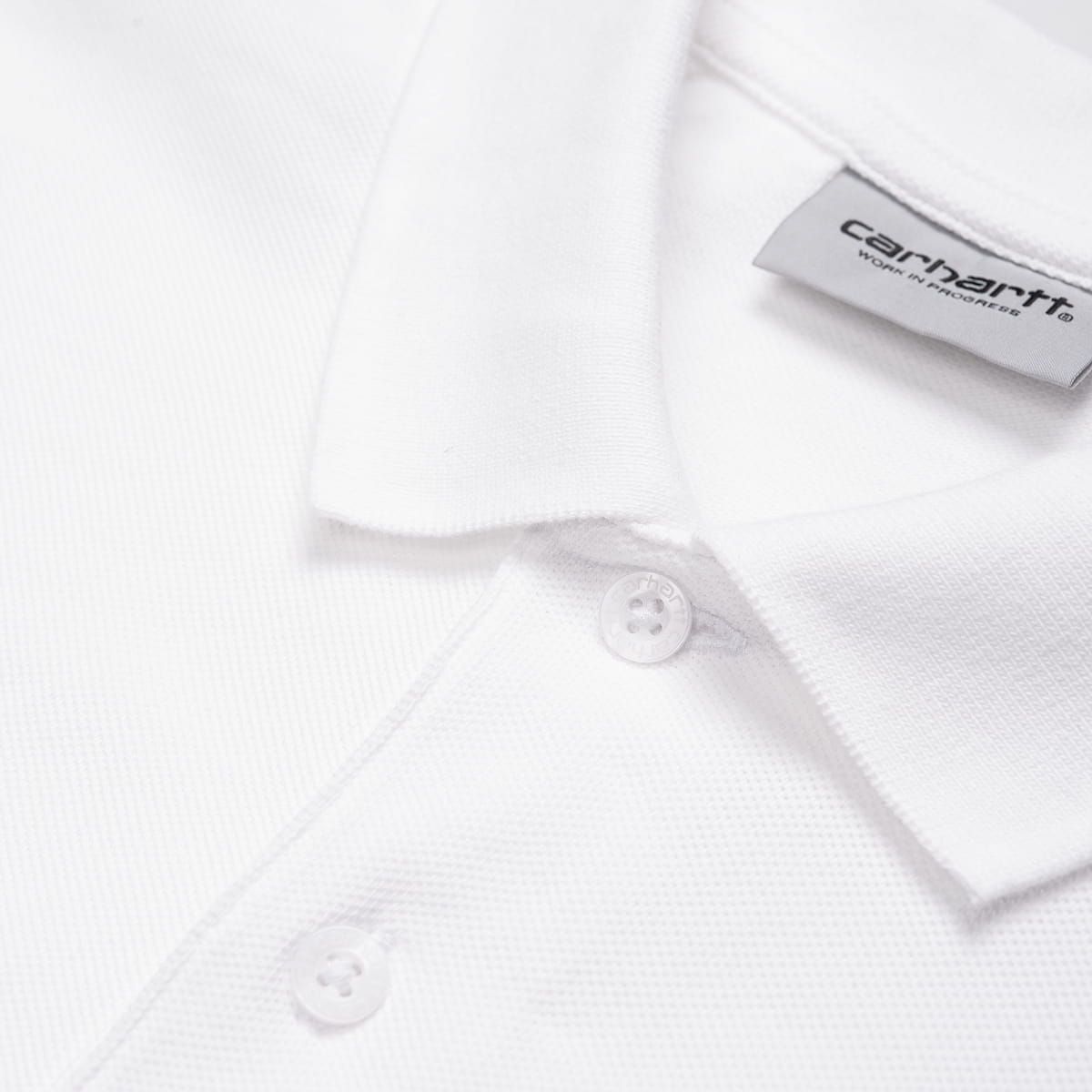 Este camiseta blanca de ajuste holgado cuenta con cuello polo de sarga, manga corta, tira con dos botones, ventilación en las costuras laterales y el emblemático logo de la "C" de Carhartt WIP bordado en dorado en el lado izquierdo del pecho.