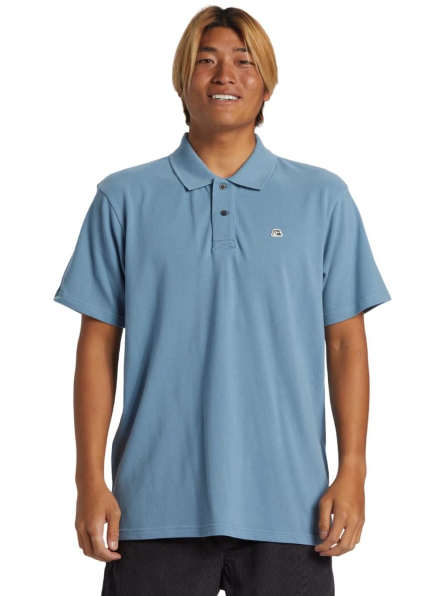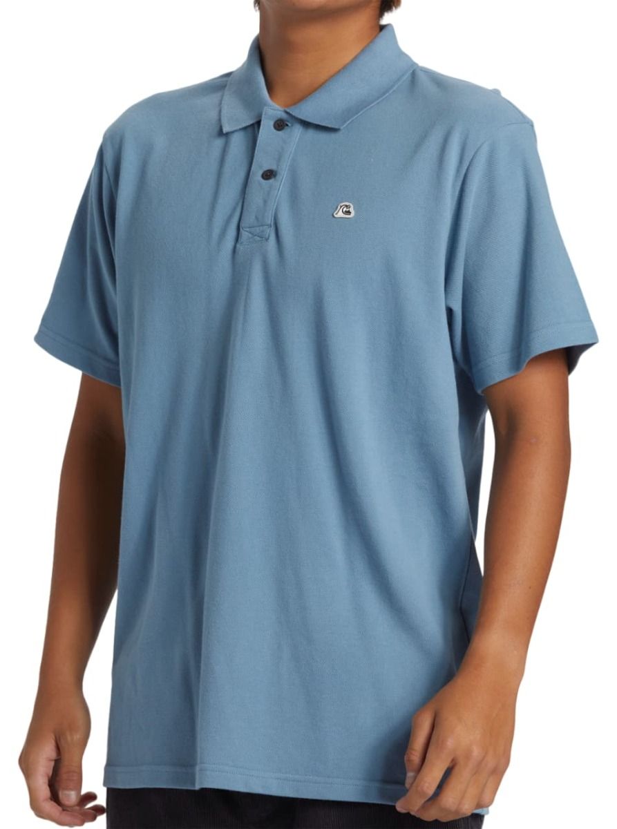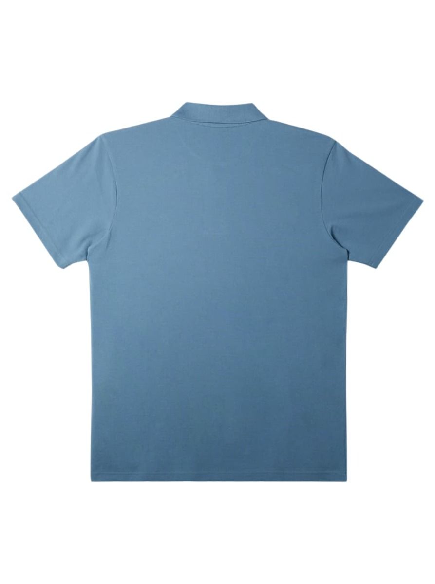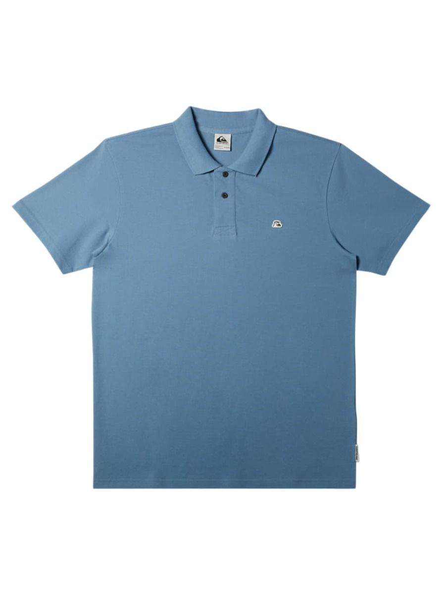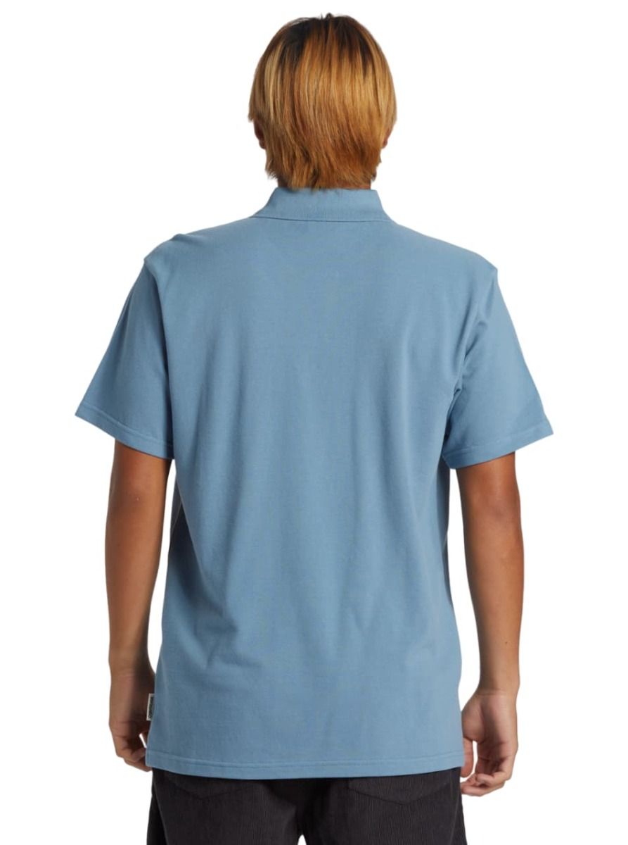 Esta camiseta sostenible azul de corte normal cuenta con manga corta, cuello polo con cierre de 3 botones y un parche Quiksilver bordado en el lado izquierdo del pecho.