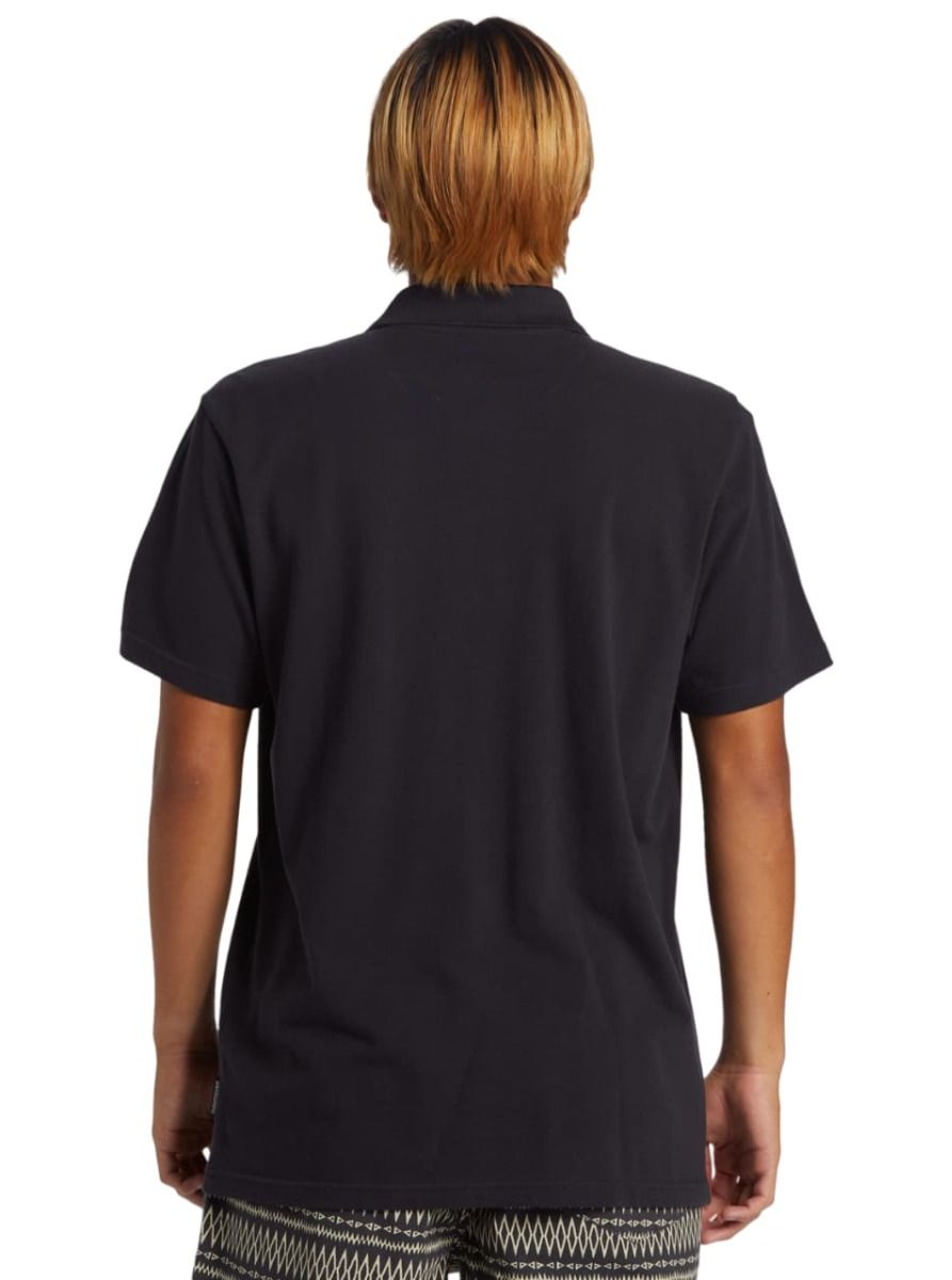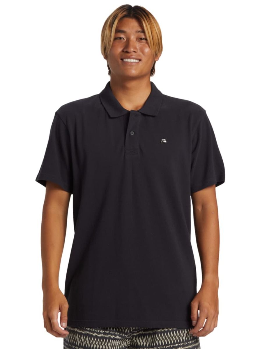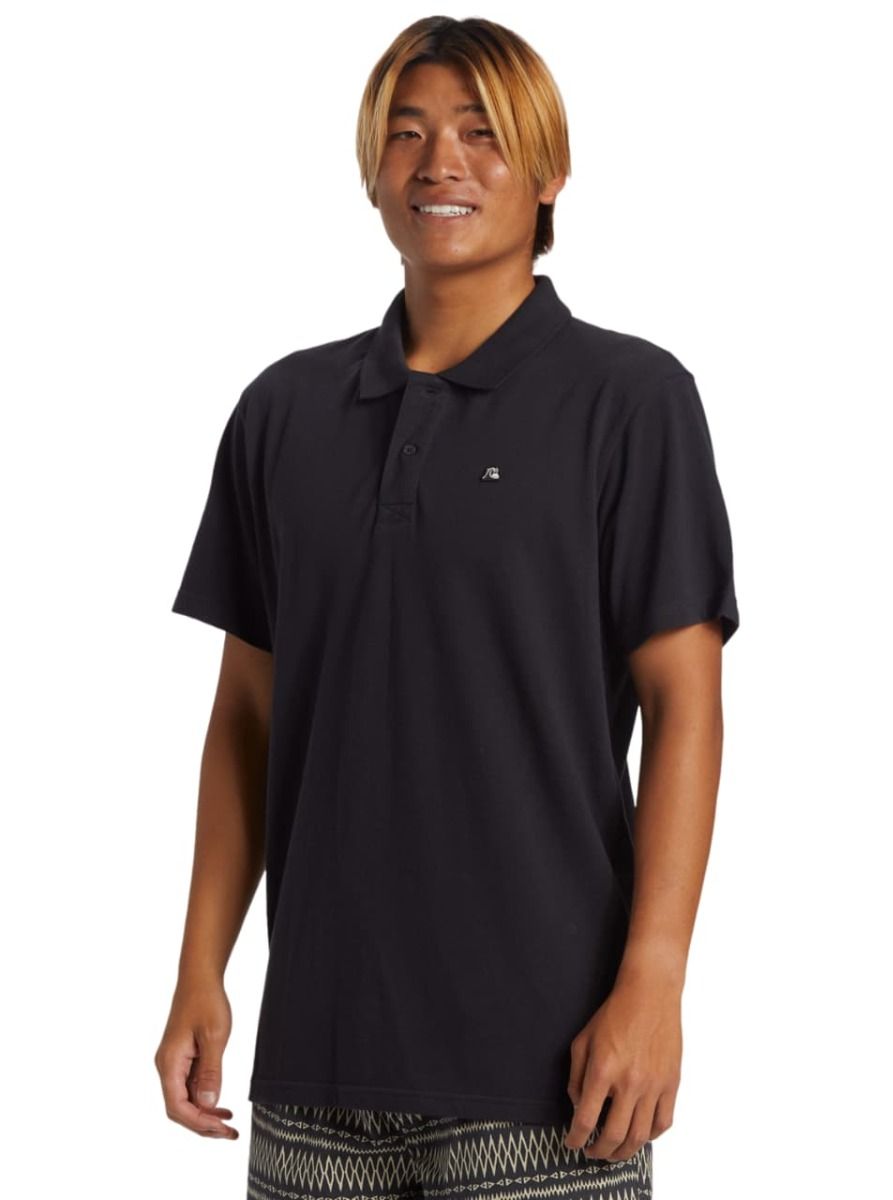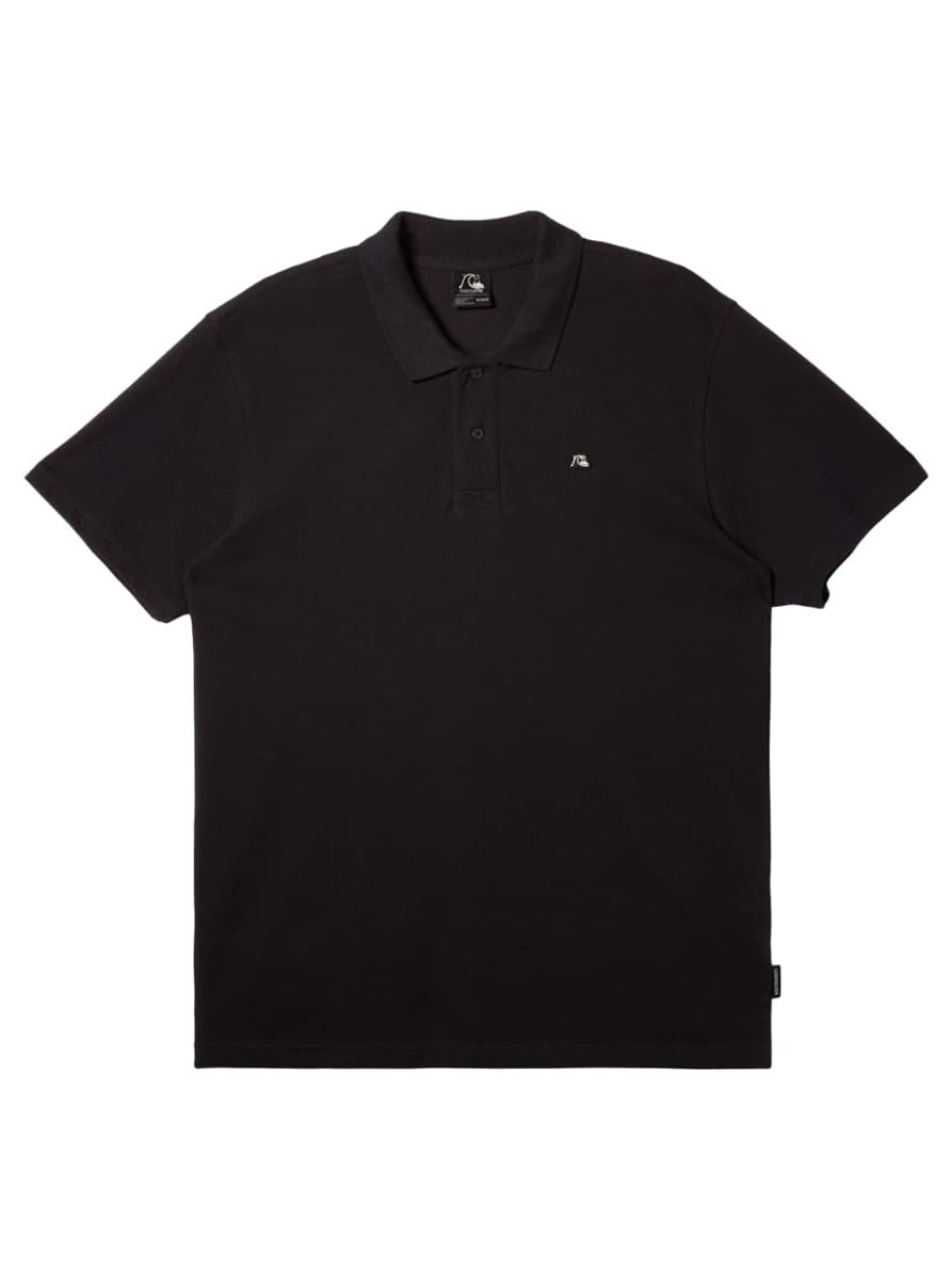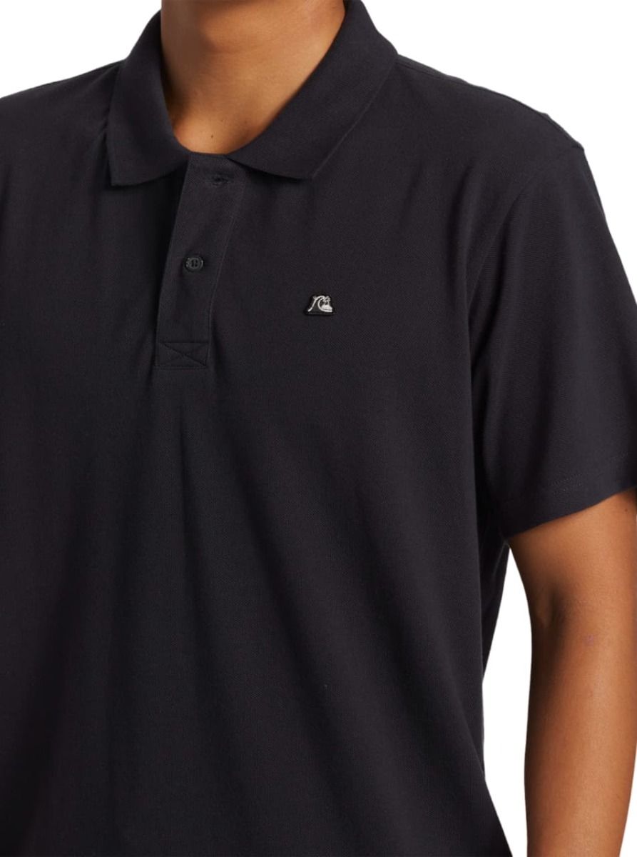 Esta camiseta sostenible azul marino de corte normal cuenta con manga corta, cuello polo con cierre de 3 botones y un pequeño parche Quiksilver bordado en el lado izquierdo del pecho.
