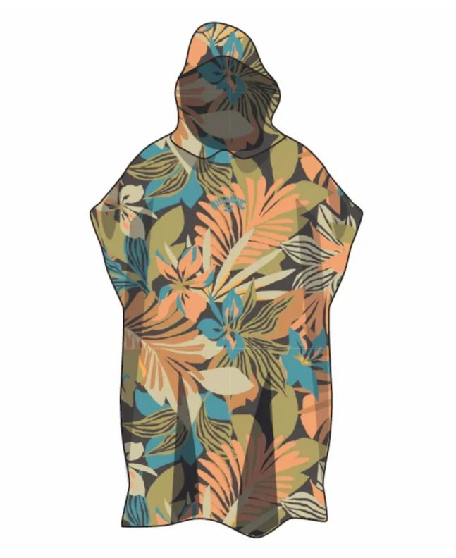 Poncho cambiador Billabong para mujer en algodón 100% con capucha y estampado tropical Black Pebble.