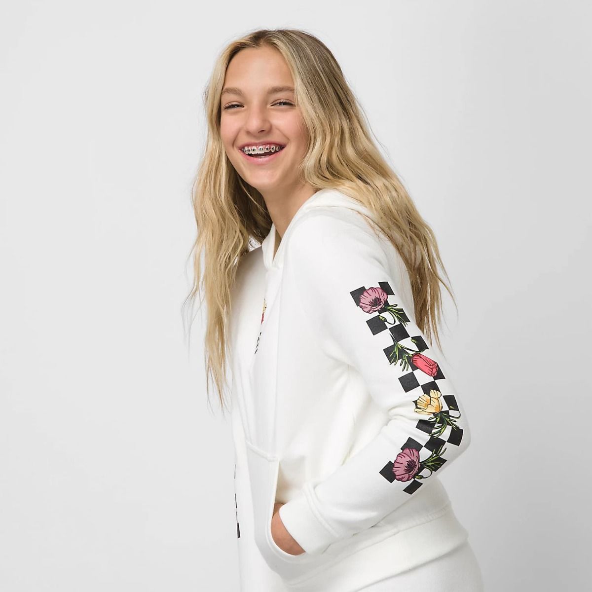 La sudadera con capucha para niñas de entre 8 y 14 años Poppin Poppies en blanco (Marshmallow) de Vans ha sido confeccionada con 60% algodón y 40% poliéster.