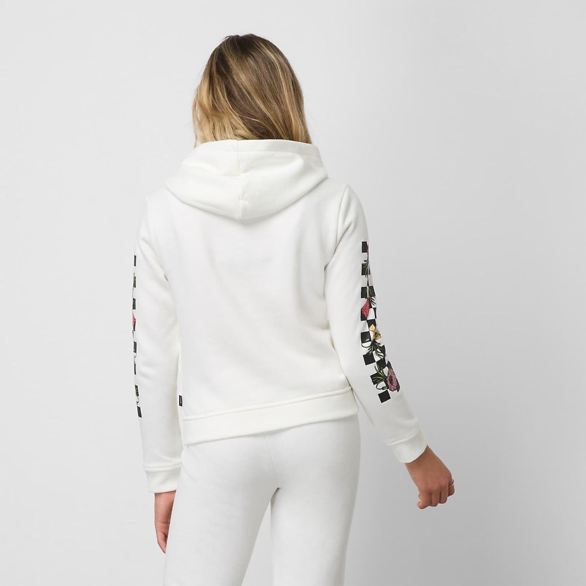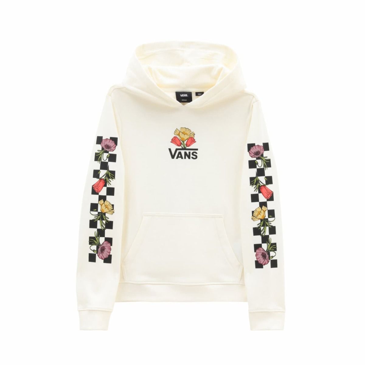 Este cómodo hoodie de ajuste clásico cuenta con capucha, un amplio bolsillo tipo canguro, estampado checkerboard floral en las mangas y el logo de Vans con motivos florales serigrafiado en la parte delantera.