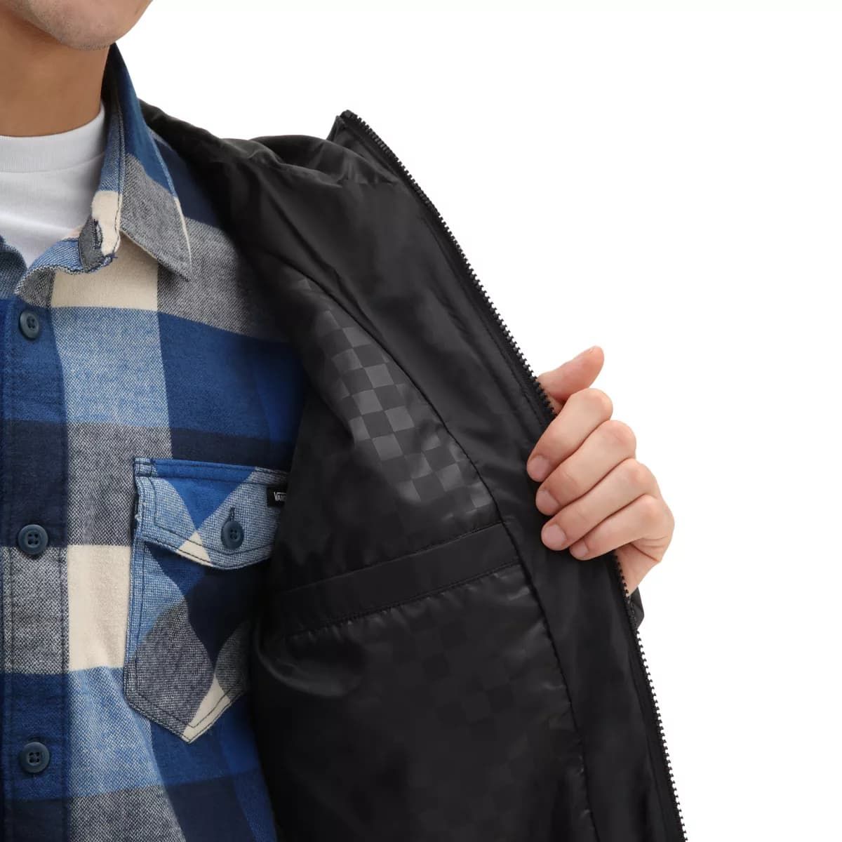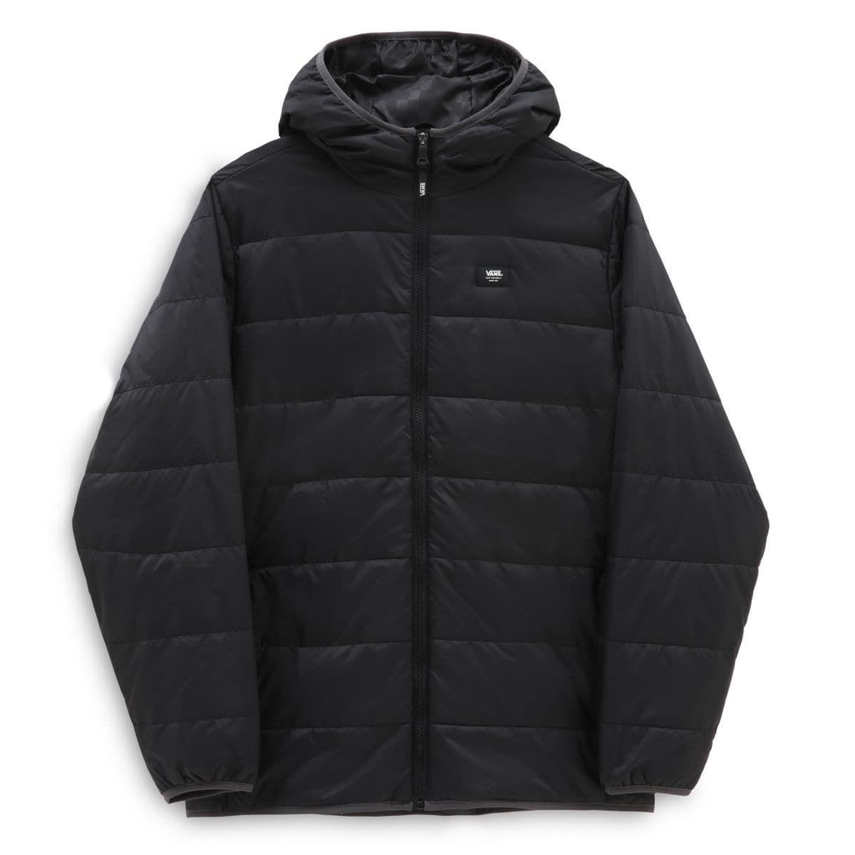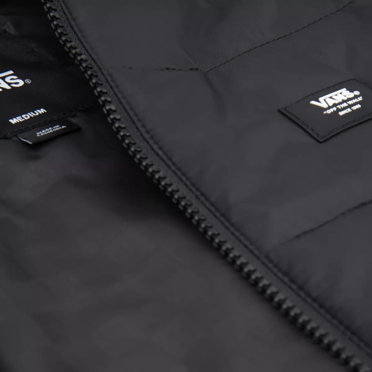 Este plumífero de estilo clásico, diseñado especialmente para hacer frente a las inclemencias del tiempo, cuenta con relleno acolchado para mayor calidez, capucha, cuello alto, cierre frontal de cremallera completa, bolsillos delanteros de cremallera, un bolsillo interior y una etiqueta Vans tejida en el lado izquierdo del pecho.