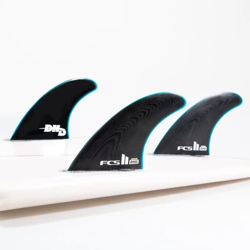 Las quillas para tabla de surf FCS II Darren Handley (DHD) Tri Fins en talla M (Medium) y color negro están fabricadas con Performance Glass (PG), a partir de capas de fibra de vidrio sólido cortadas a máquina con acabado a mano.