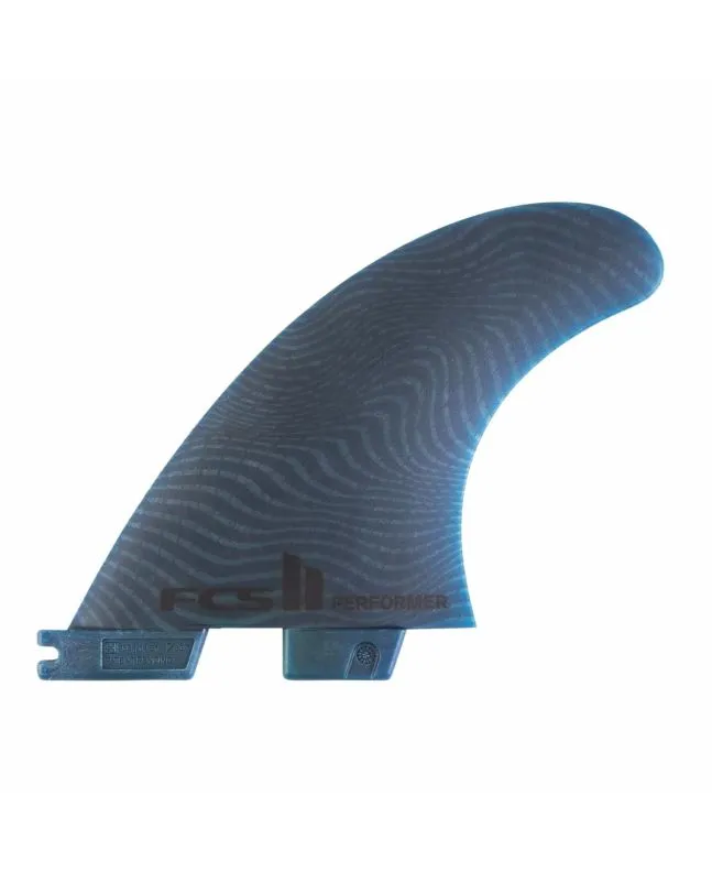 Las quillas para tabla de surf FCS II Performer Neo Glass Eco Tri-Fins en talla L y color azul tienen el logo de FCS estampado.