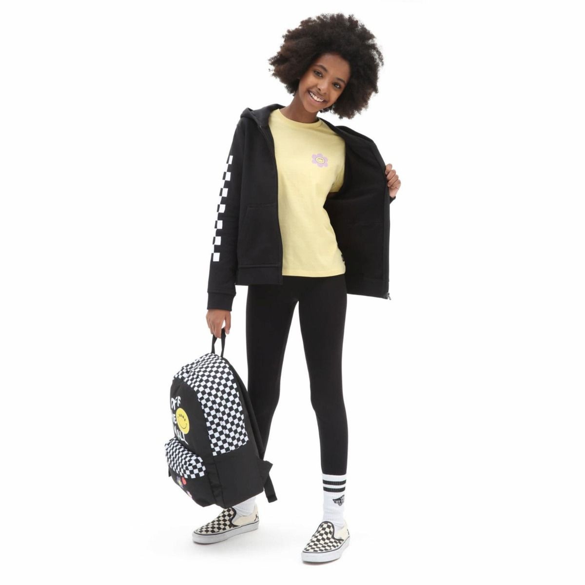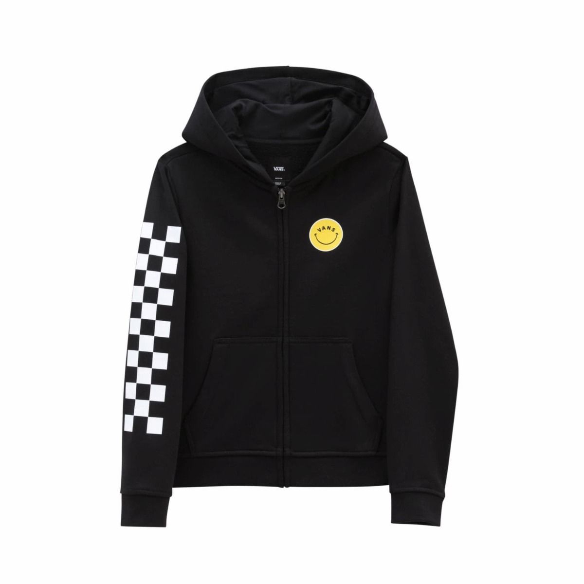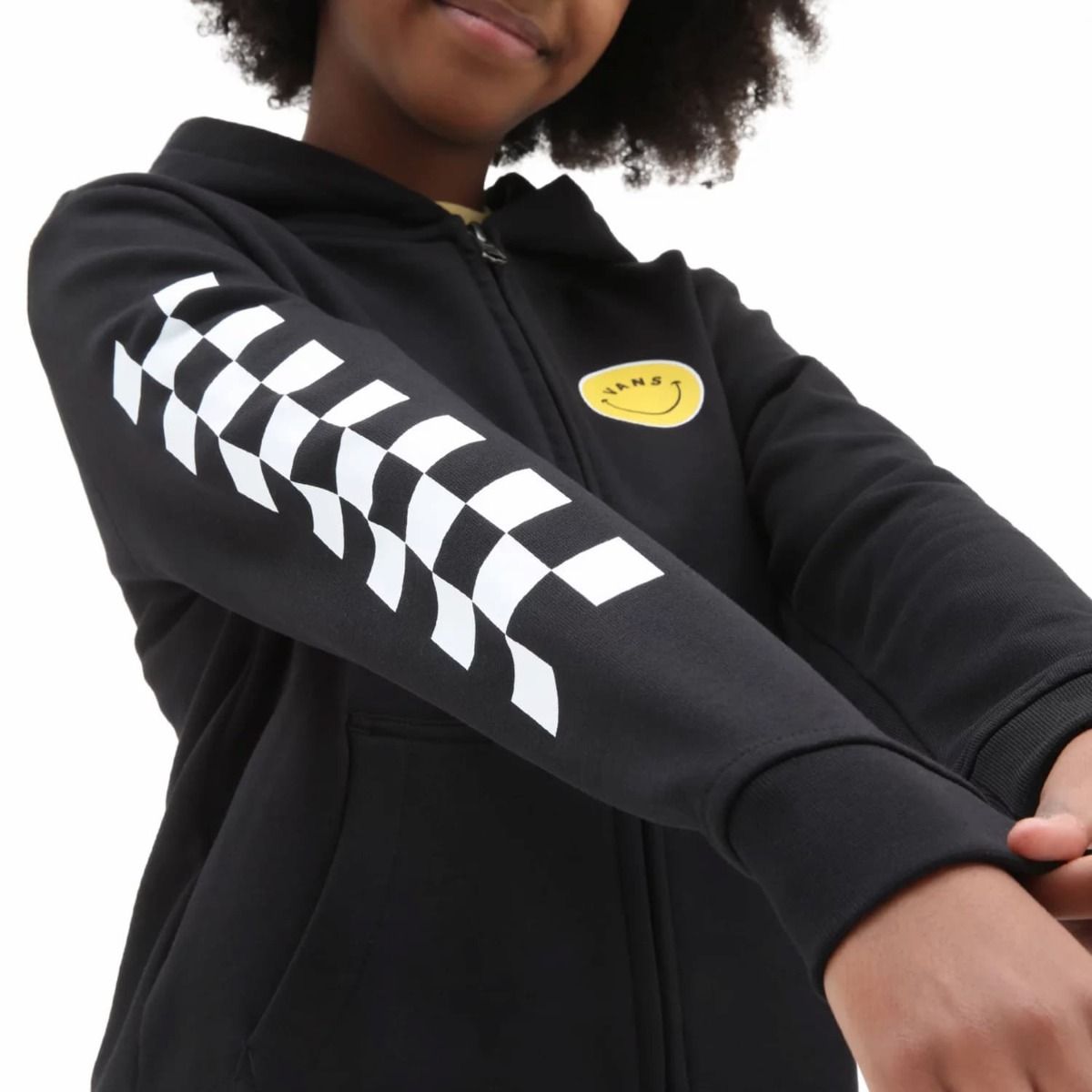 Este cómodo zip hoodie de corte clásico para chica cuenta con capucha, cierre frontal de cremallera, bolsillo tipo canguro, estampados serigrafiados de emoticonos sonrientes y un gráfico checkerboard estampado en la manga derecha.