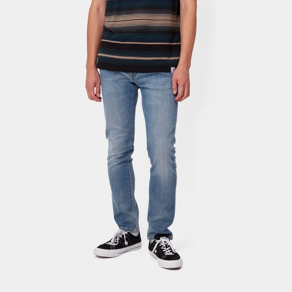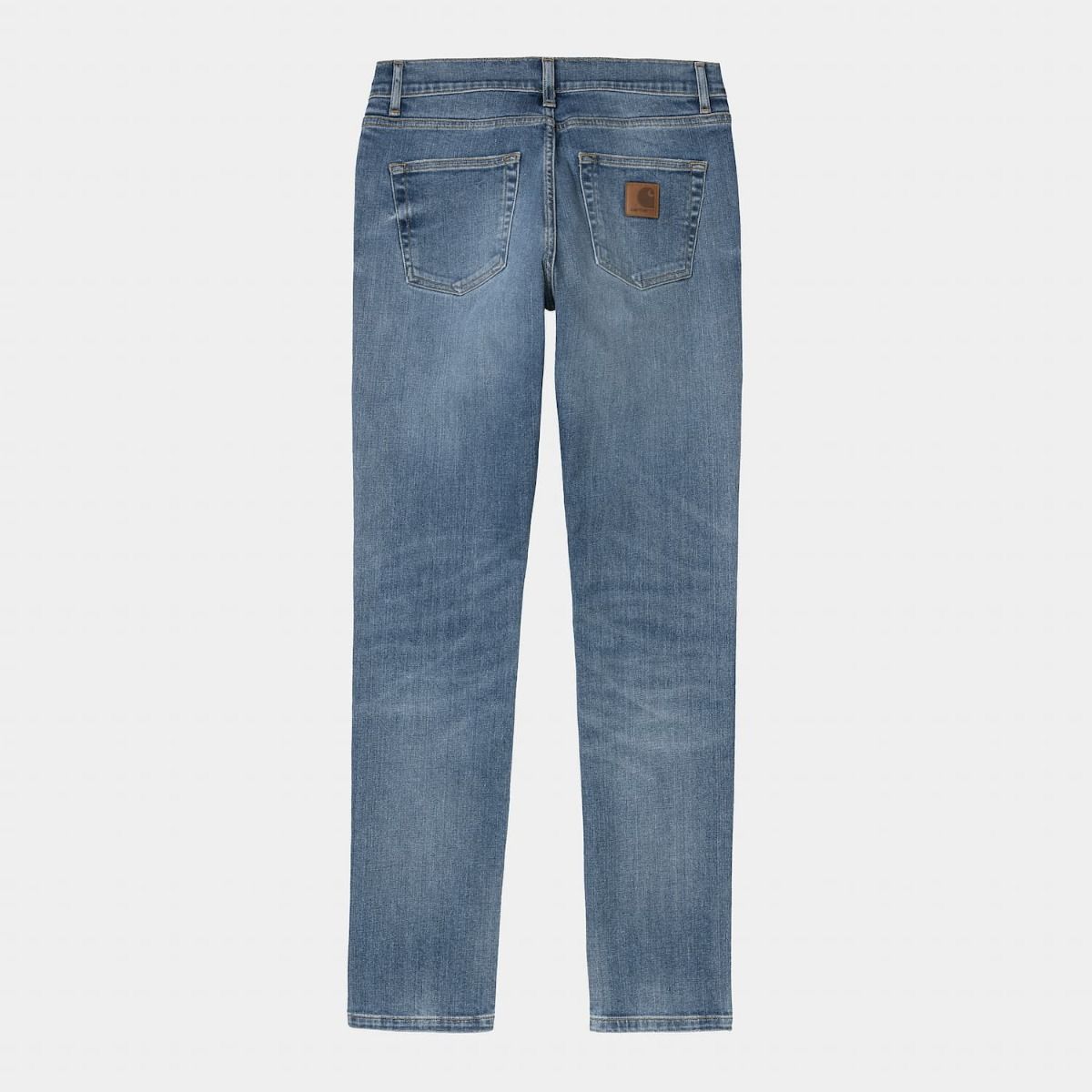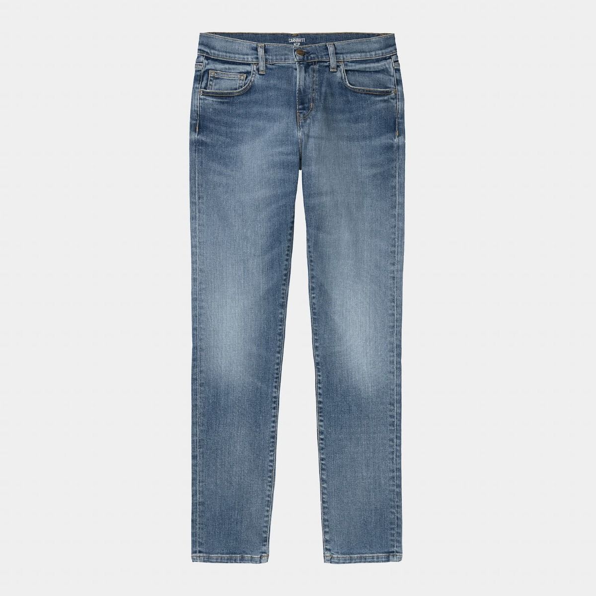 Estos jeans de tiro bajo y corte slim para hombre cuentan con bragueta con cierre de cremallera, canesú trasero, costuras reforzadas en zonas de tensión, bolsillos delanteros, bolsillo para monedas, bolsillos posteriores y una etiqueta de piel sintética con el logo de Carhartt cosida en el bolsillo posterior derecho.