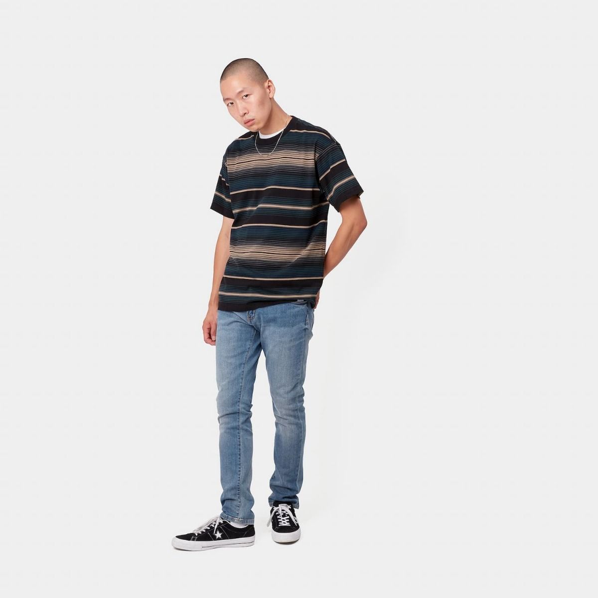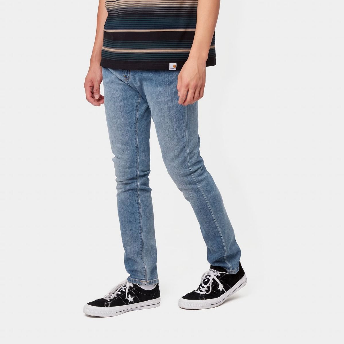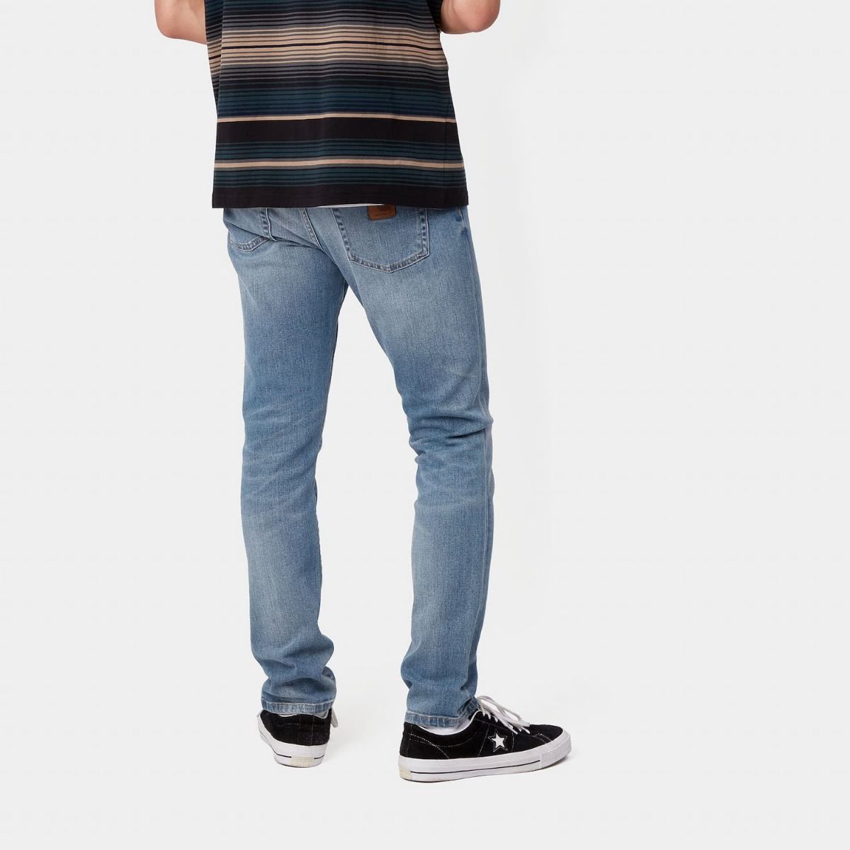 Estos jeans de tiro bajo y corte slim para hombre cuentan con bragueta con cierre de cremallera, canesú trasero, costuras reforzadas en zonas de tensión, bolsillos delanteros, bolsillo para monedas, bolsillos posteriores y una etiqueta de piel sintética con el logo de Carhartt cosida en el bolsillo posterior derecho.