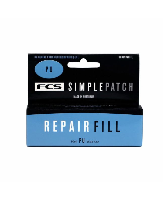El FCS Simple Patch Repair Fill (PU) es un compuesto de reparación rápida diseñado para rellenar grietas, abolladuras y pequeños agujeros en tablas de surf con construcción de poliéster (PU). Su fórmula a base de resina de poliéster con Q-Cel y curado por luz UV permite reparaciones sólidas, limpias y rápidas en cualquier lugar con exposición solar.