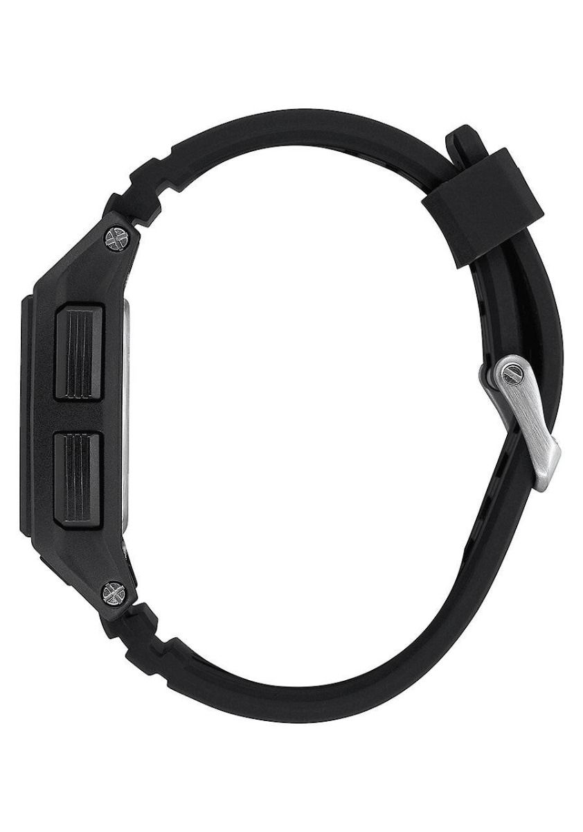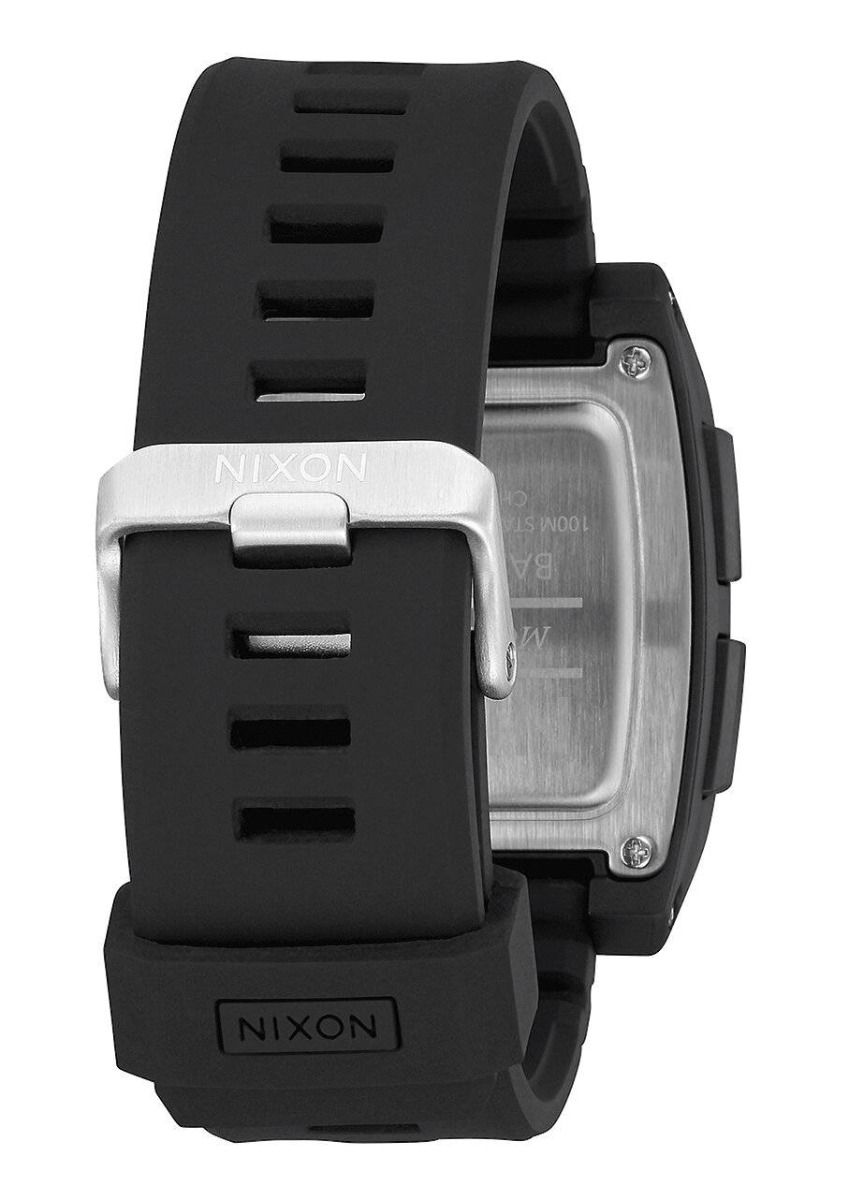 La esfera de este reloj de mareas Nixon es de LCD en negativo con gráfico de mareas impreso. También cuenta la hora del día (en formato de 12 o 24 horas), día/fecha, hora de salida y puesta de sol, mareas futuras y pasadas, doble hora, alarma, temporizador de cuenta atrás, cuentaolas, cronógrafo y retroiluminación EL.