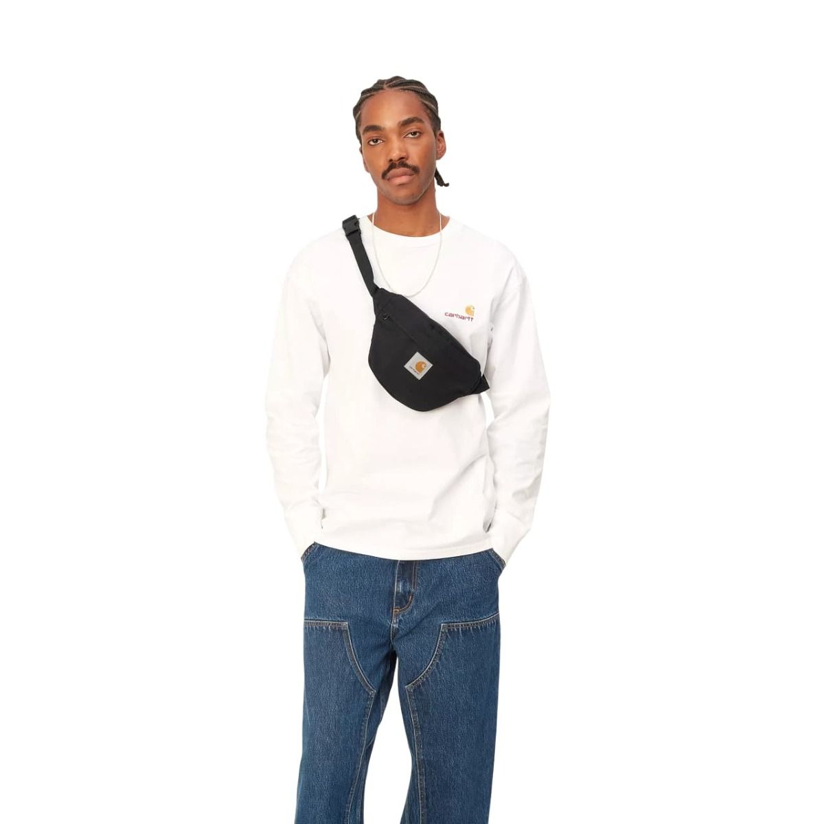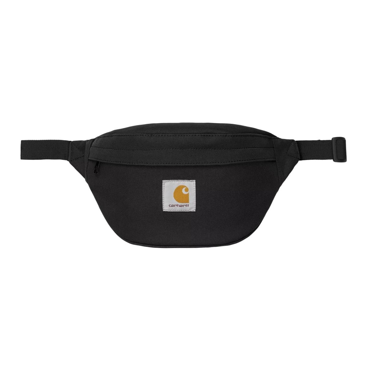 Este bolso de cadera color negro sin forro presenta un amplio bolsillo principal con cierre de cremallera oculta, bolsillo con cremallera en la parte posterior, cinturón ajustable y una etiqueta cuadrada con el logo de Carhartt tejida en el frontal.