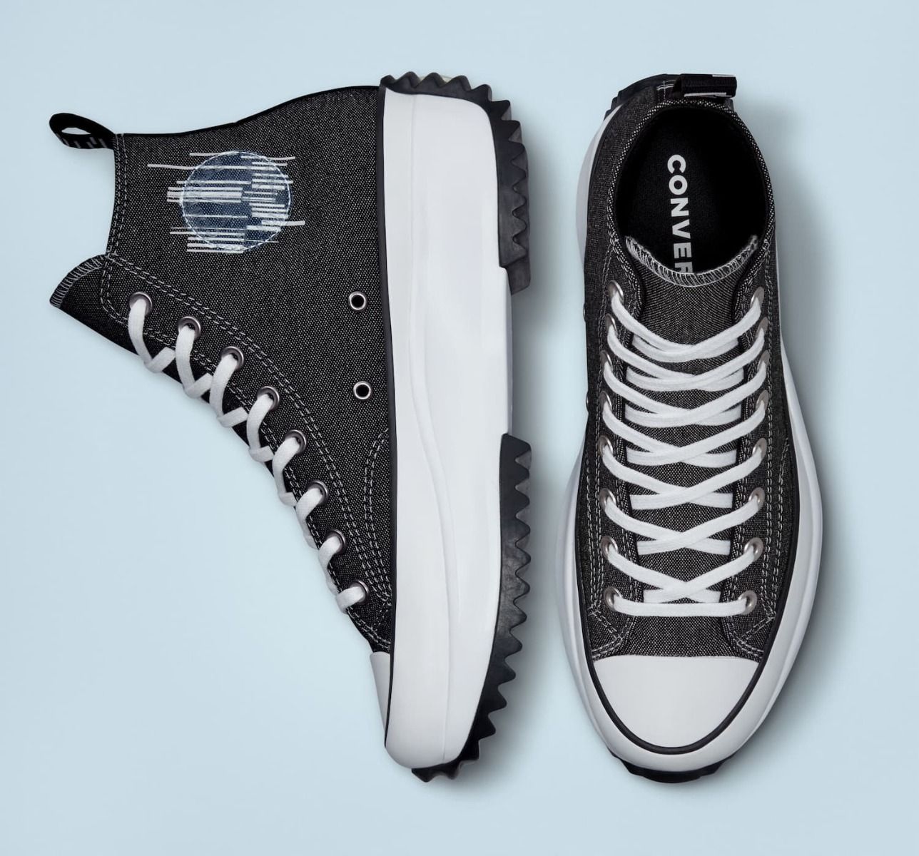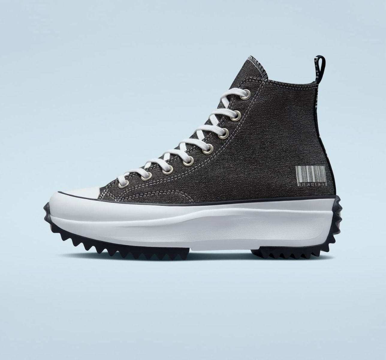 Las zapatillas de plataforma Run Star Hike High Top Translucent Barcode negras y blancas tienen la estrella Converse All Star en el talón.