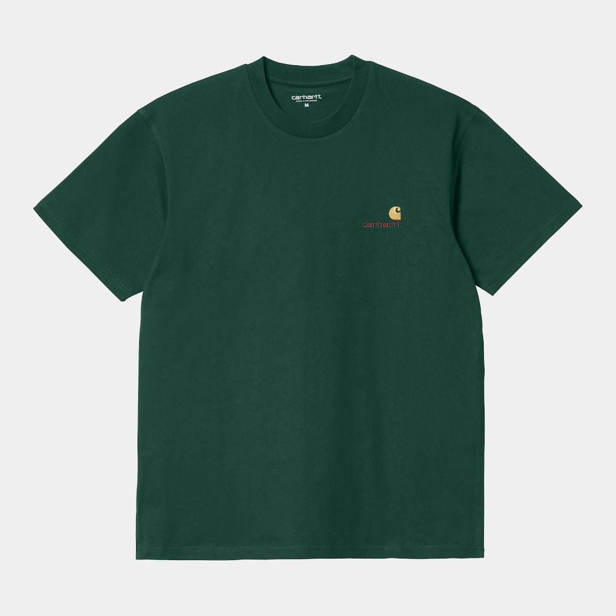 La camiseta para hombre American Script verde (Hedge) de Carhartt WIP está confeccionada con punto de Jersey 100% algodón orgánico.