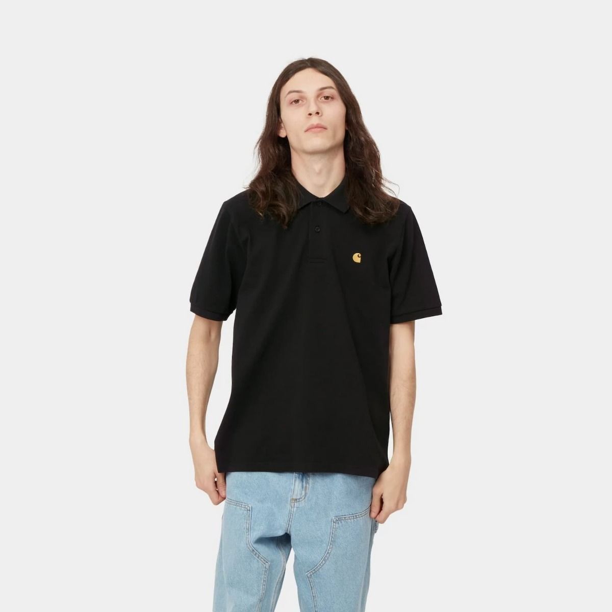 El polo de manga corta para hombre Chase Pique negro con el logo en dorado (Black/Gold) de Carhartt WIP está confeccionado con tejido 100% de algodón piqué lavado.