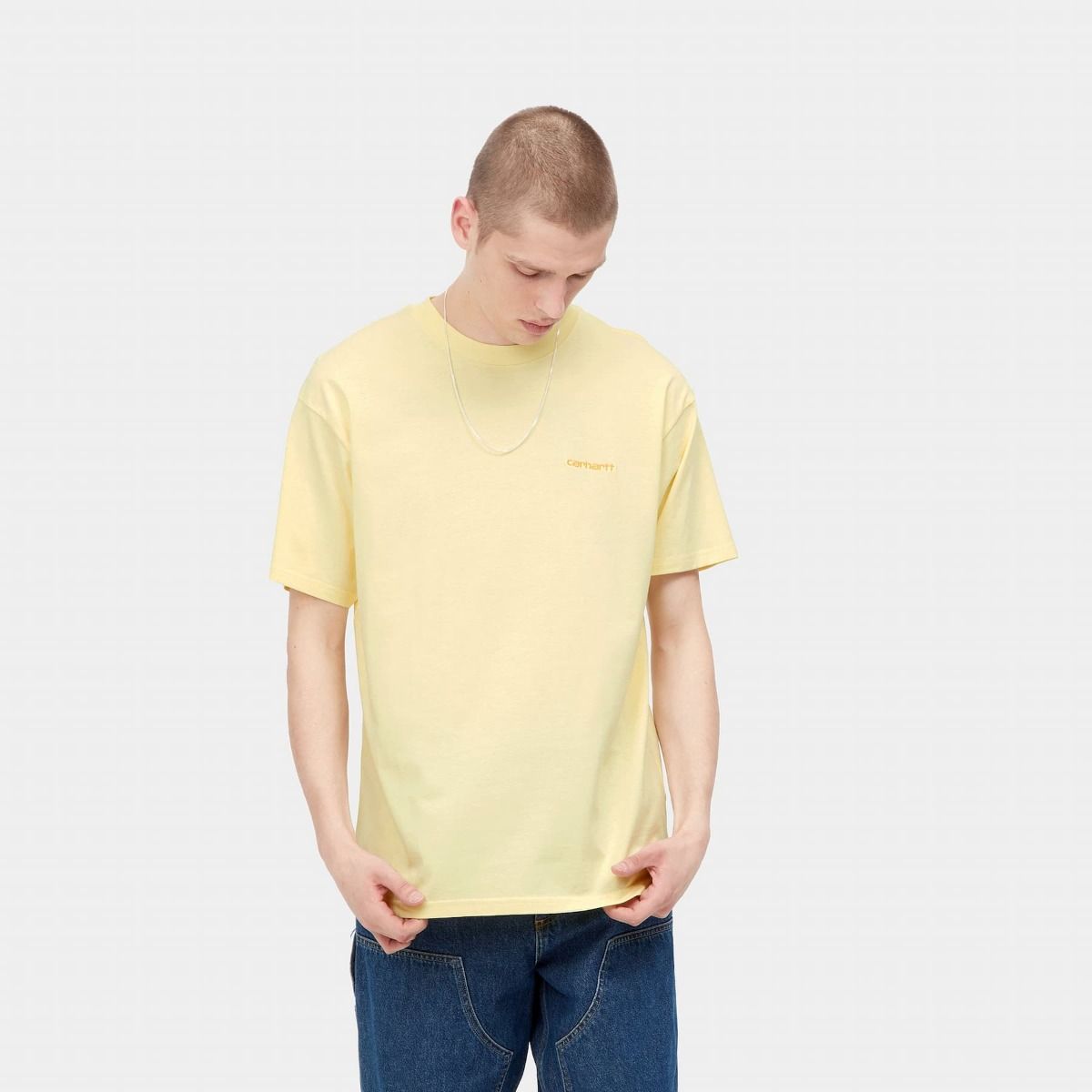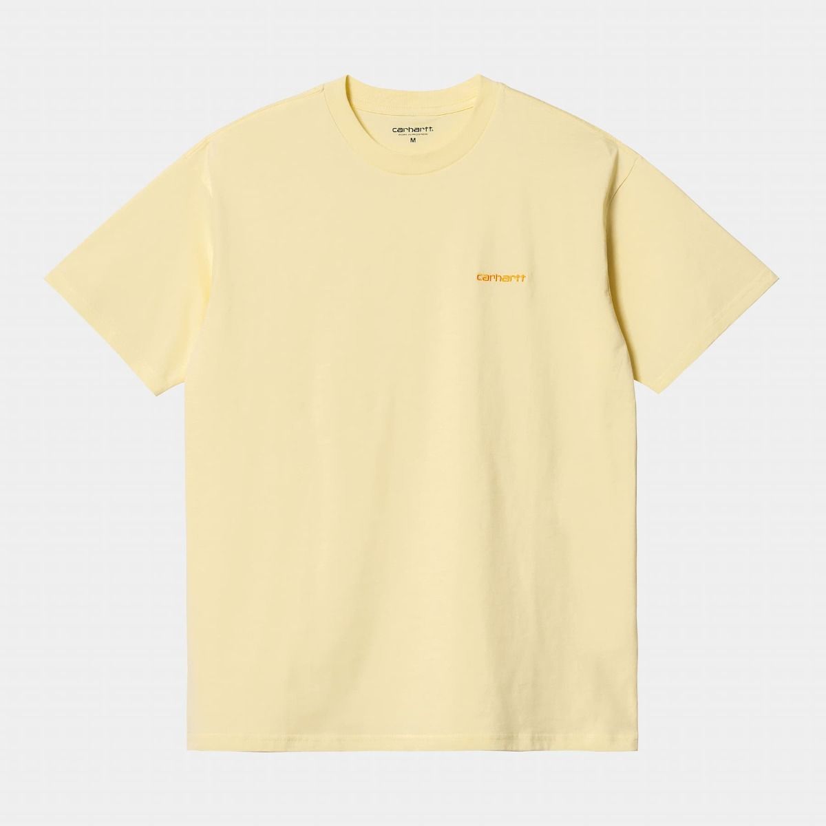 La camiseta de manga corta Script Embroidery SS en amarillo de Carhartt WIP está confeccionada con tejido punto jersey de algodón sencillo.