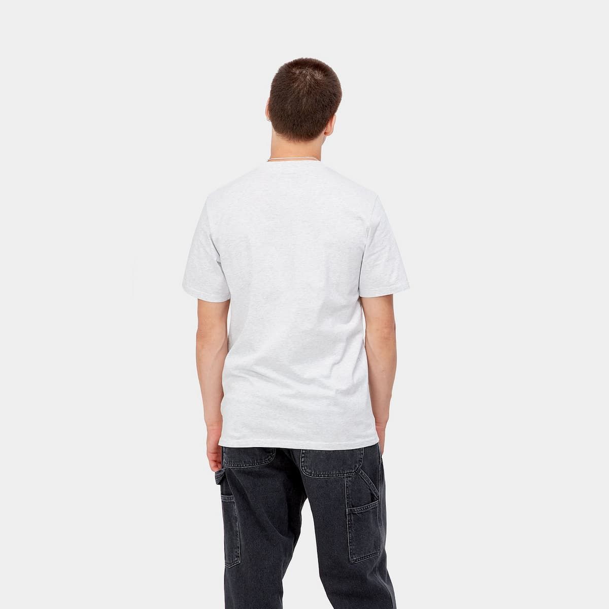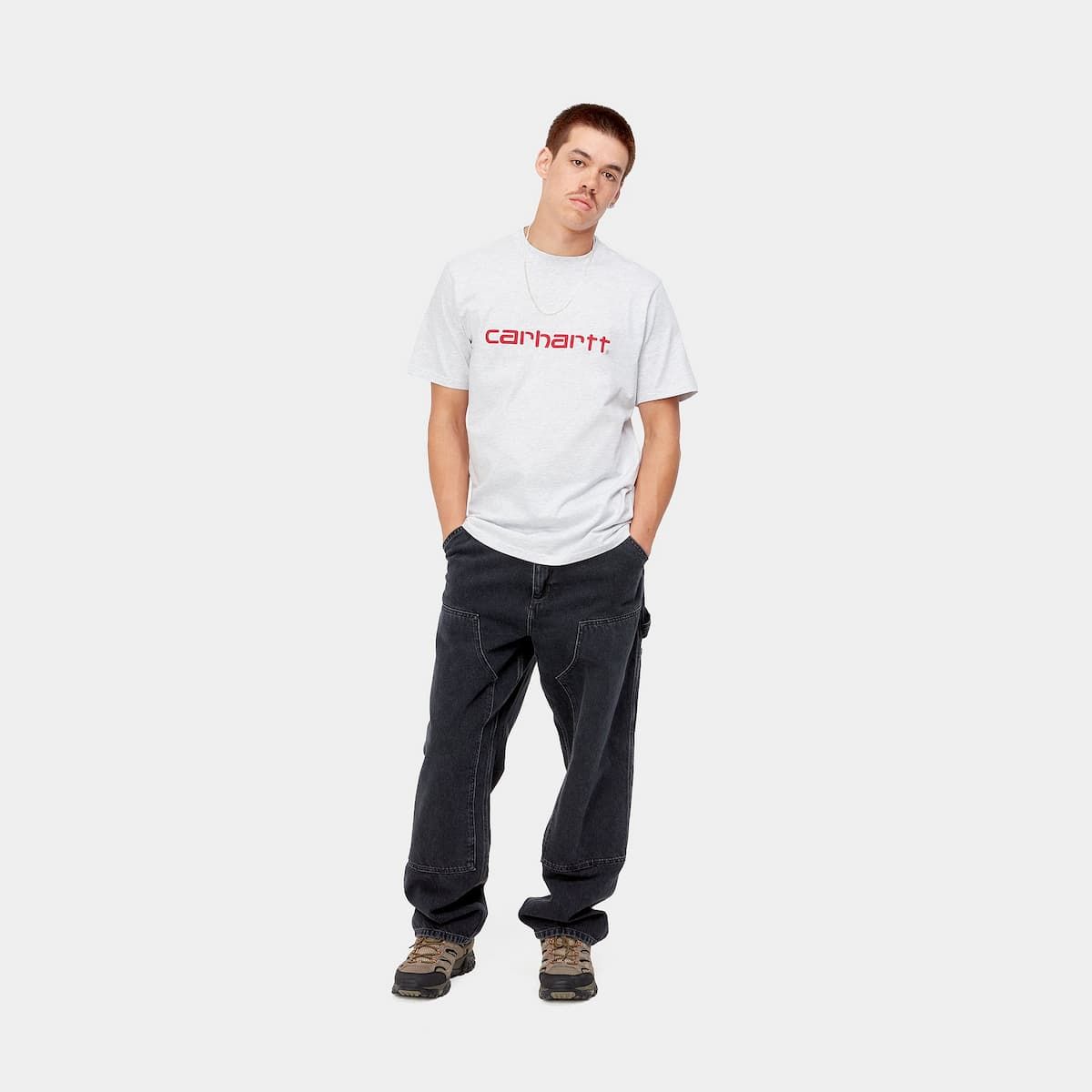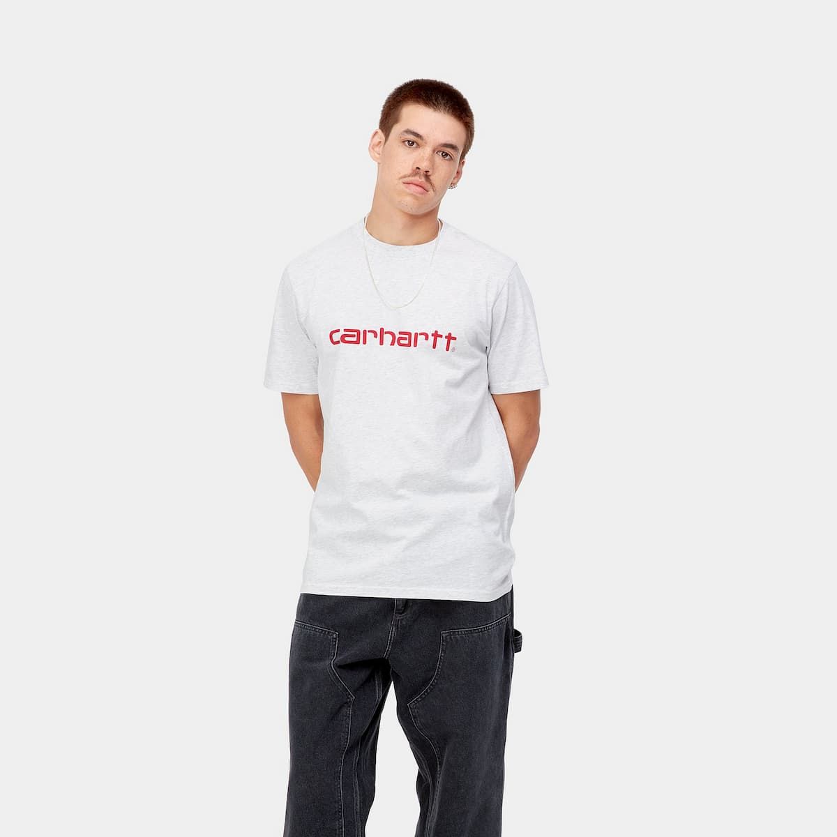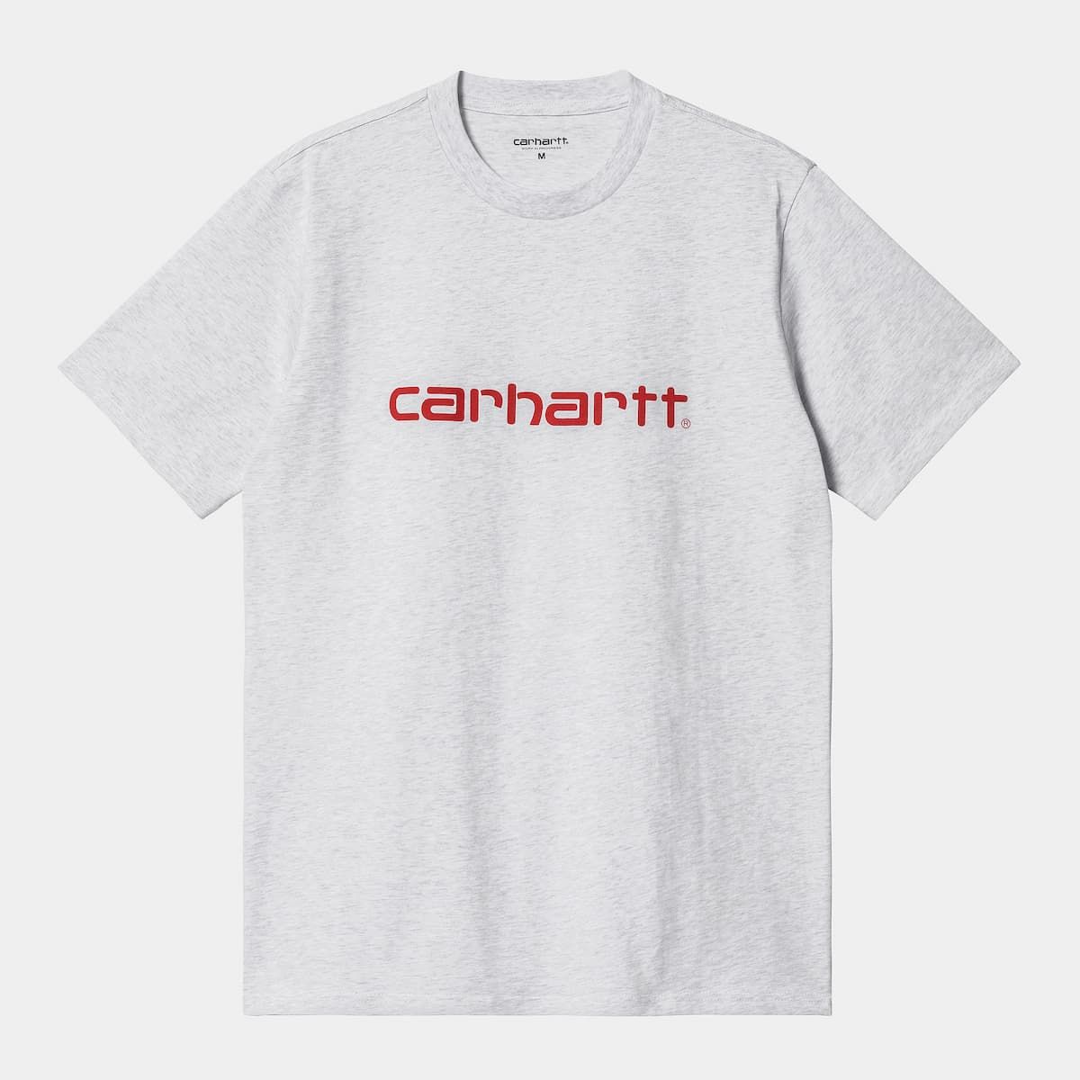 La camiseta de manga corta para hombre Script en gris con el logo en rojo (Ash Heather/Rocket) de Carhartt WIP está confeccionada con tejido punto jersey de algodón sencillo (190g/sqm).