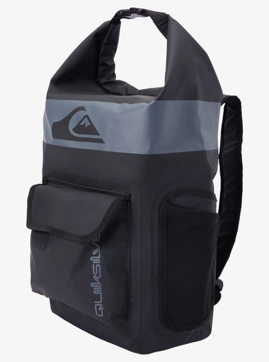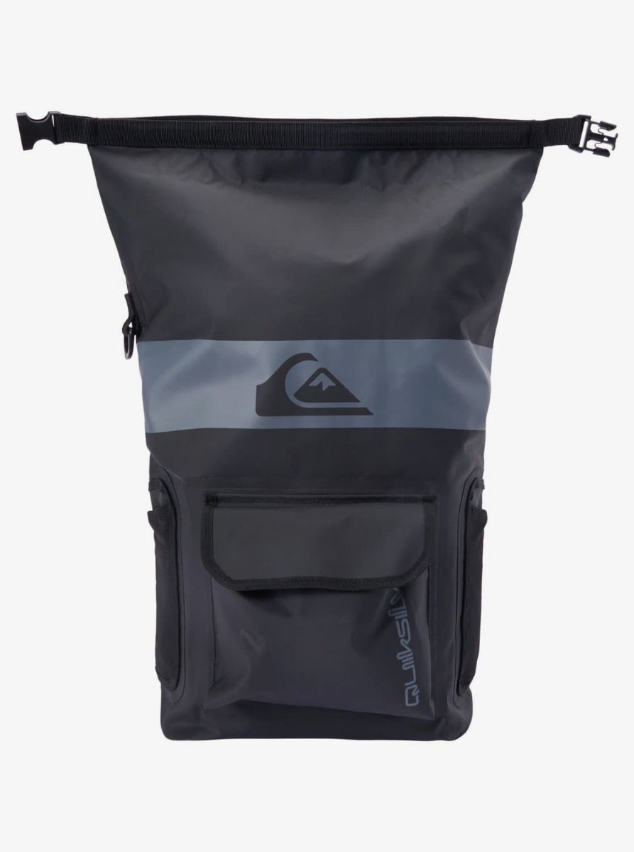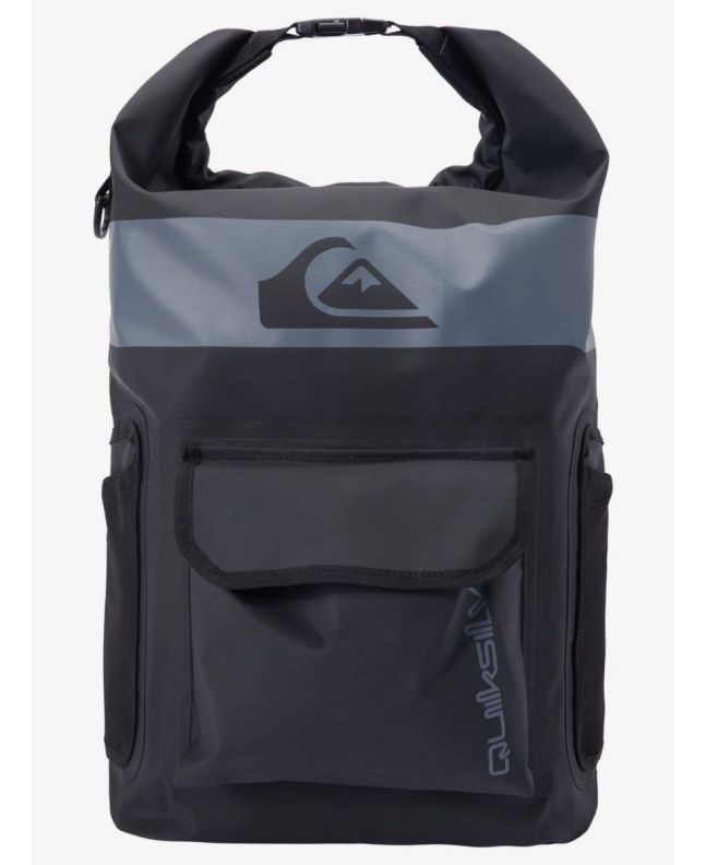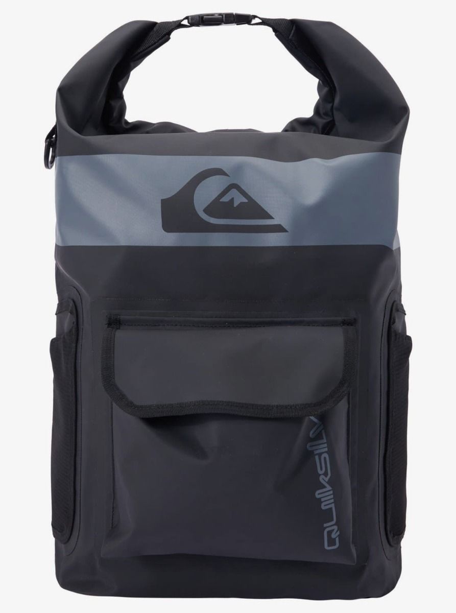 Esta práctica mochila cuenta con un amplio compartimento principal estanco reforzado para artículos mojados y secos, cierre superior enrollable, costuras reforzadas, soporte lateral para botella de agua con accesorio de anillo en D, bolsillo frontal, correas acolchadas ajustables para los hombros, asa superior con cierre de click y los logos de Quiksilver estampados.
