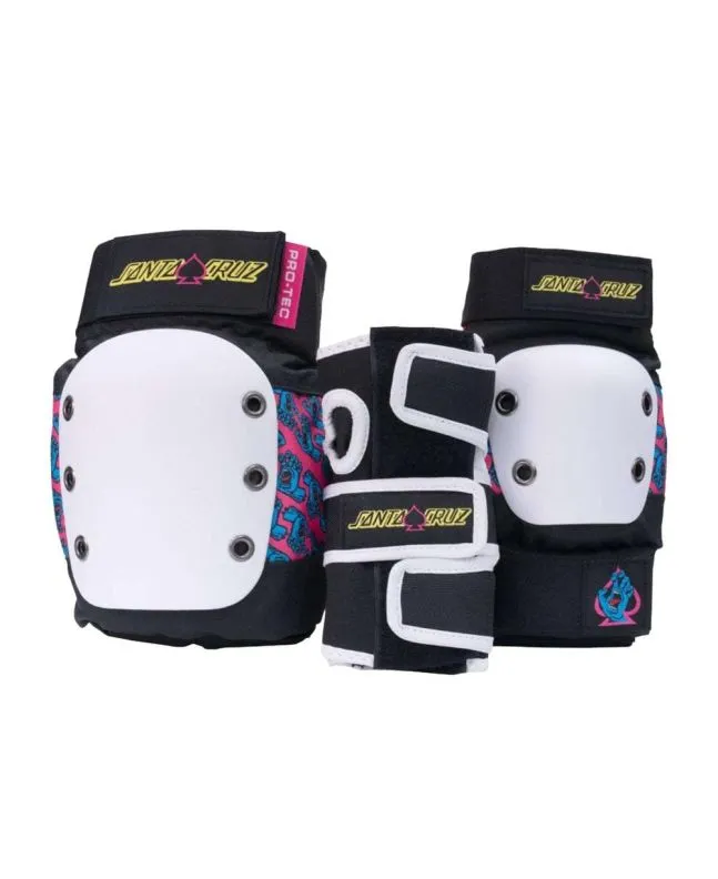 Set Pro-Tec x Santa Cruz Street 3 Pack Black/White/Pink con rodilleras, coderas y muñequeras. Protección EVA + ABS con diseño Screaming Hand.