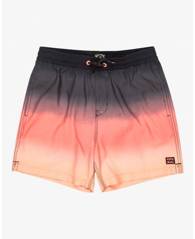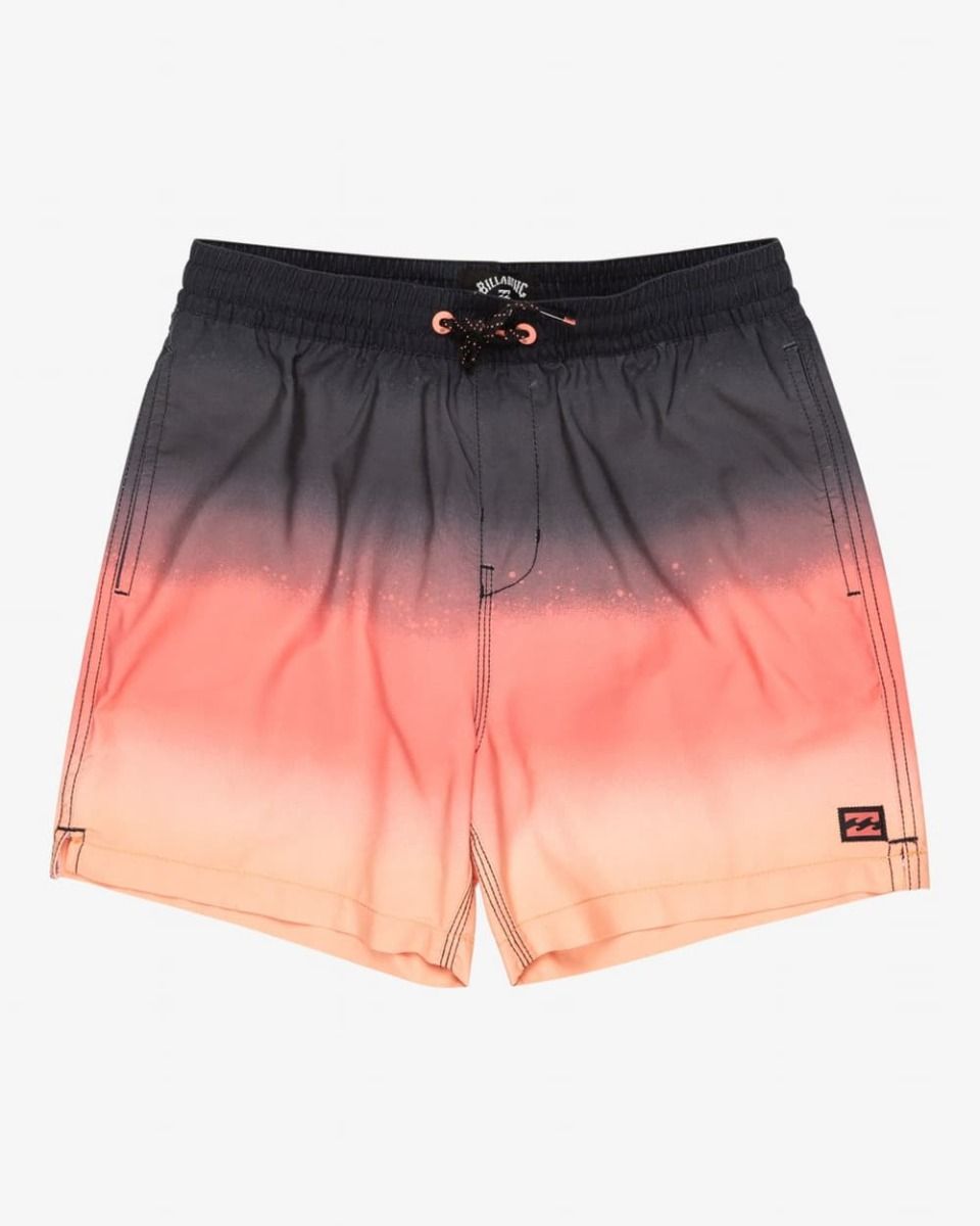 Boardshort corto Billabong para niño con estampado degradado en tonos coral y negro. Diseño cómodo con cintura elástica, bolsillos y tejido reciclado de secado rápido.