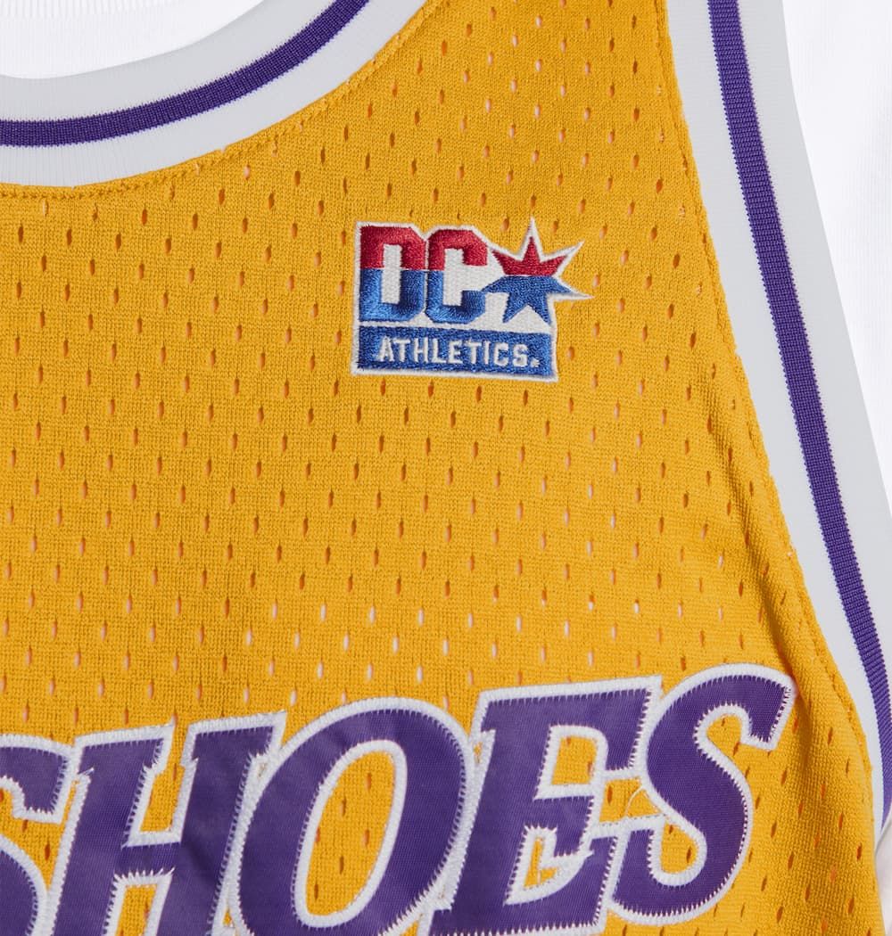 Esta camiseta de baloncesto cuenta con ajuste estándar, cuello redondo, ribete de poliéster en el cuello y las sisas, cinta de malla en la nuca, abertura lateral en el bajo, apliques de sarga estampados en la parte delantera y bordado DC Athletics en el lado izquierdo del pecho.
