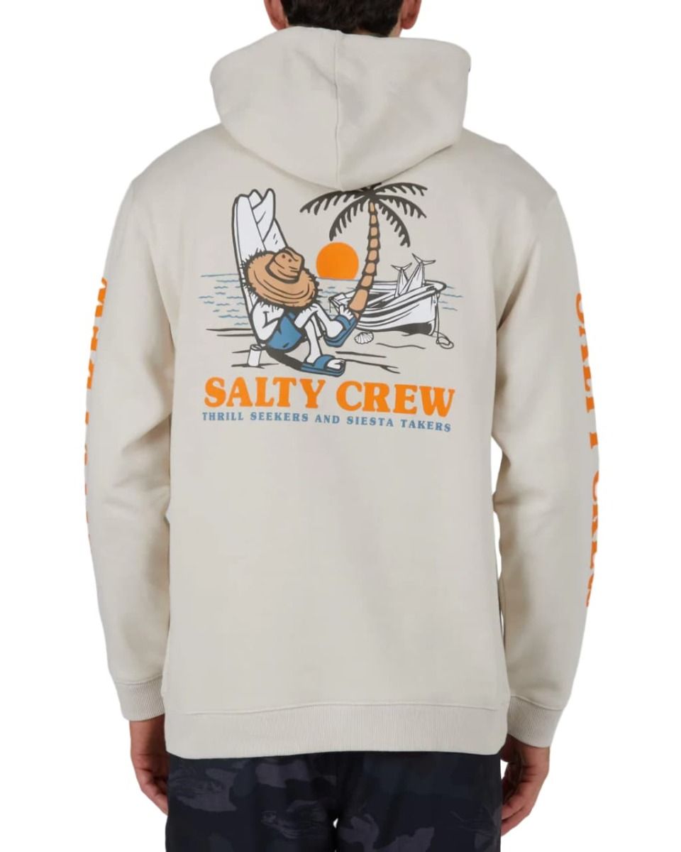 Este hoodie blanco hueso viene con capucha ajustable mediante cordón, forro interior, bolsillo delantero tipo canguro, un gráfico original Salty Crew de inspiración veraniega con la inscripción "Thrill Seekers and Siesta Takers" (Buscadores de emociones tomadores de siestas) impreso en el lado izquierdo del pecho y en la espalda, así como serigrafiado Salty Crew en las mangas.