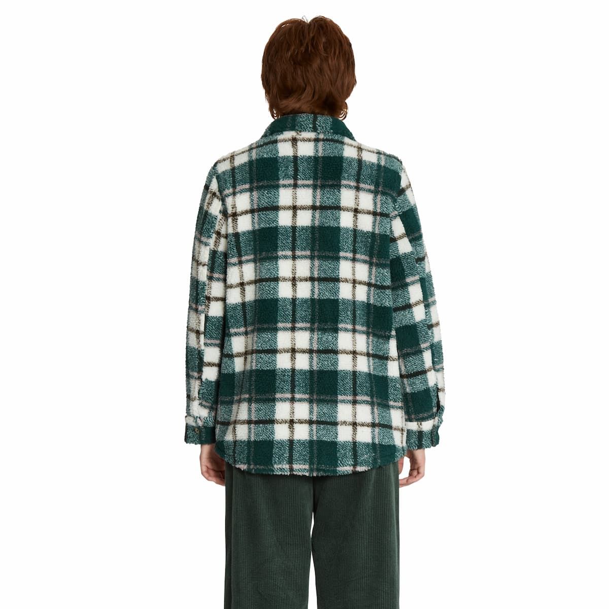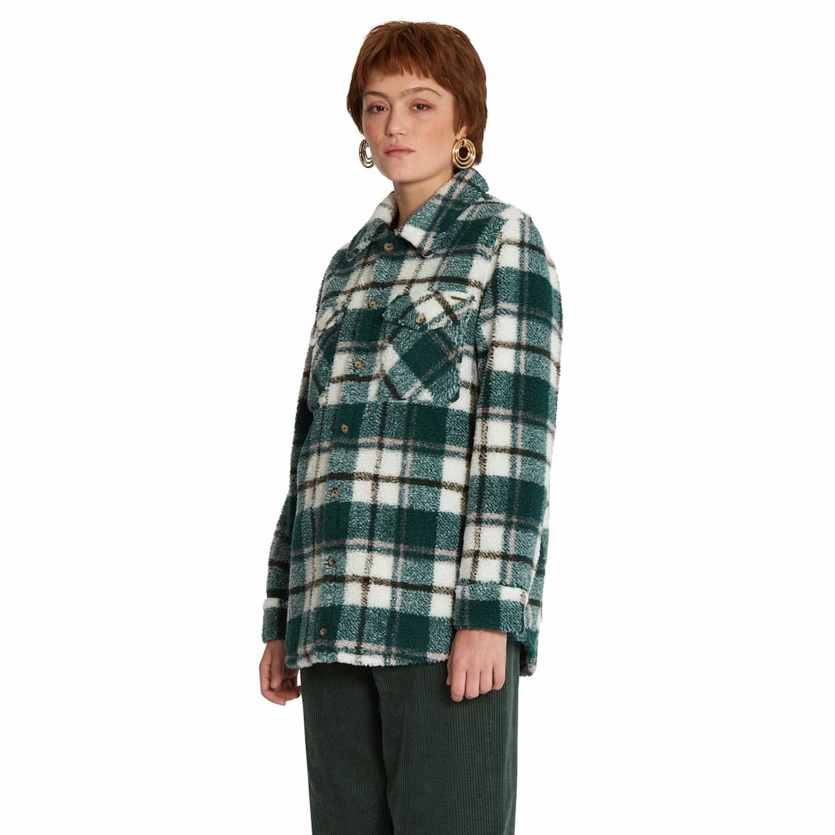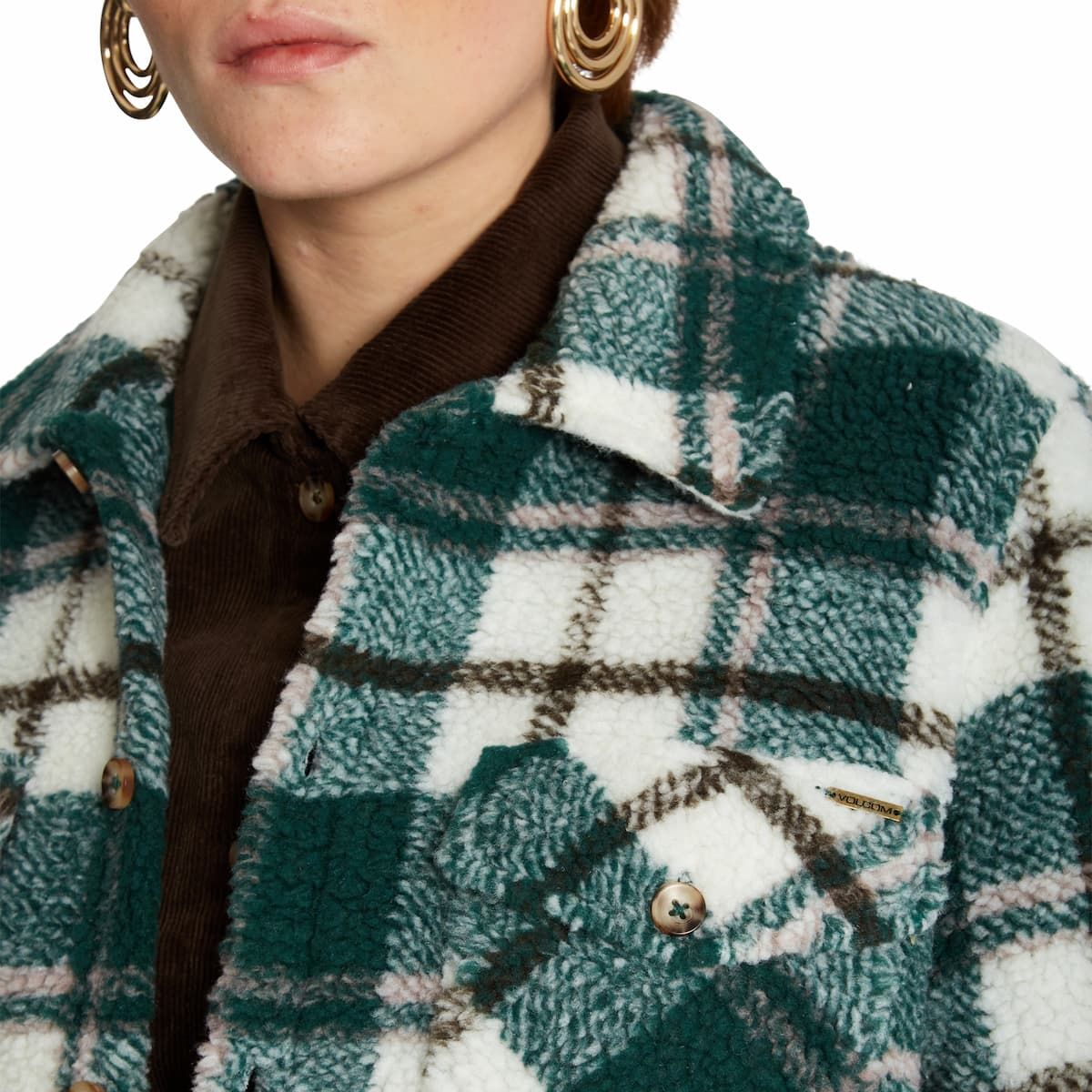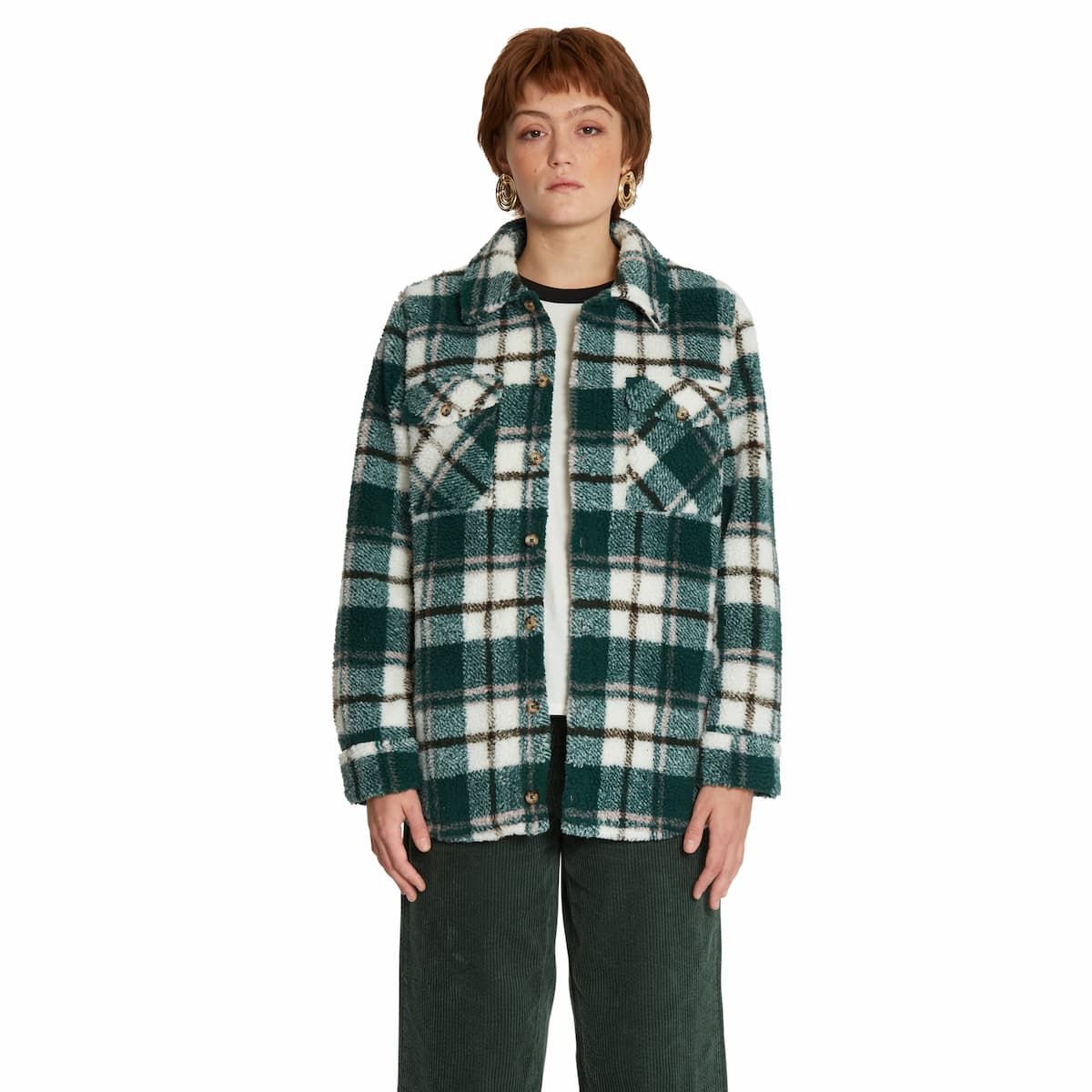La sobrecamisa de tejido sherpa para mujer Silent Jacket en verde con estampado a cuadros (Dark Pine) de Volcom está confeccionada con 100% poliéster.