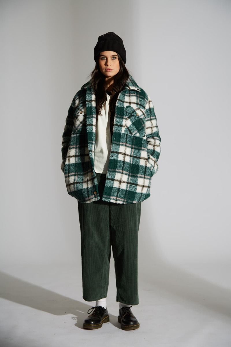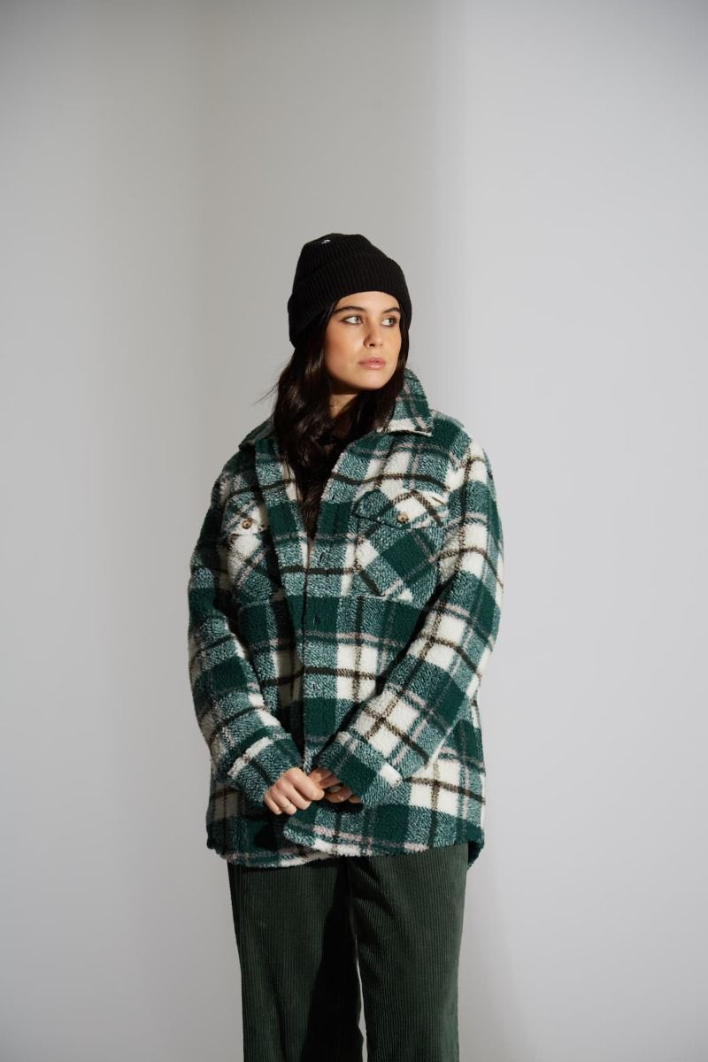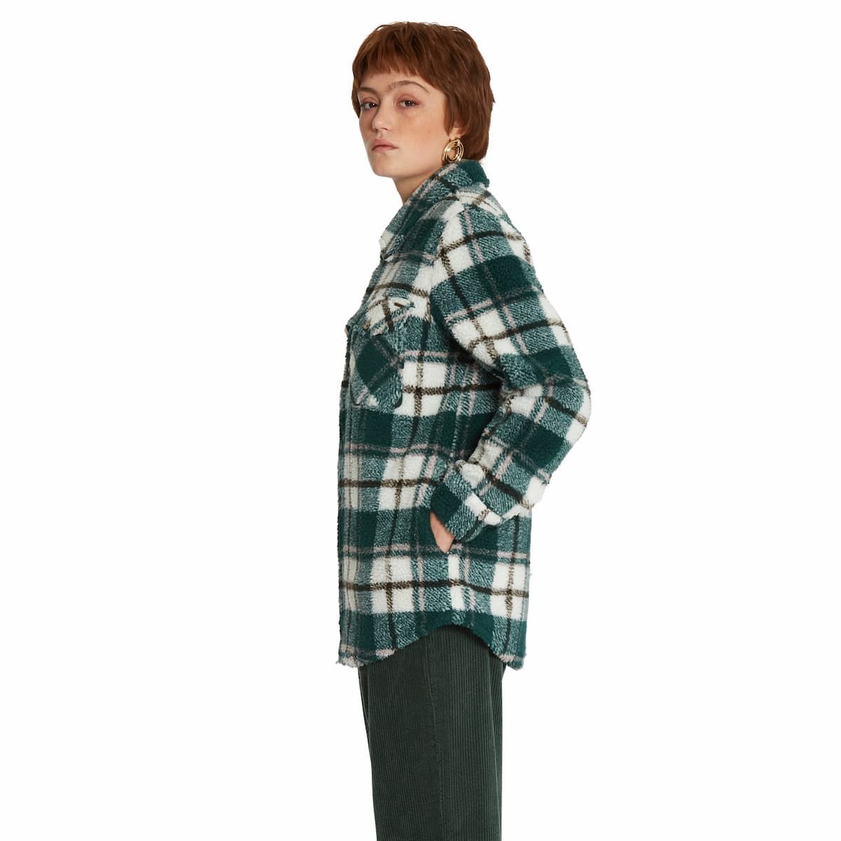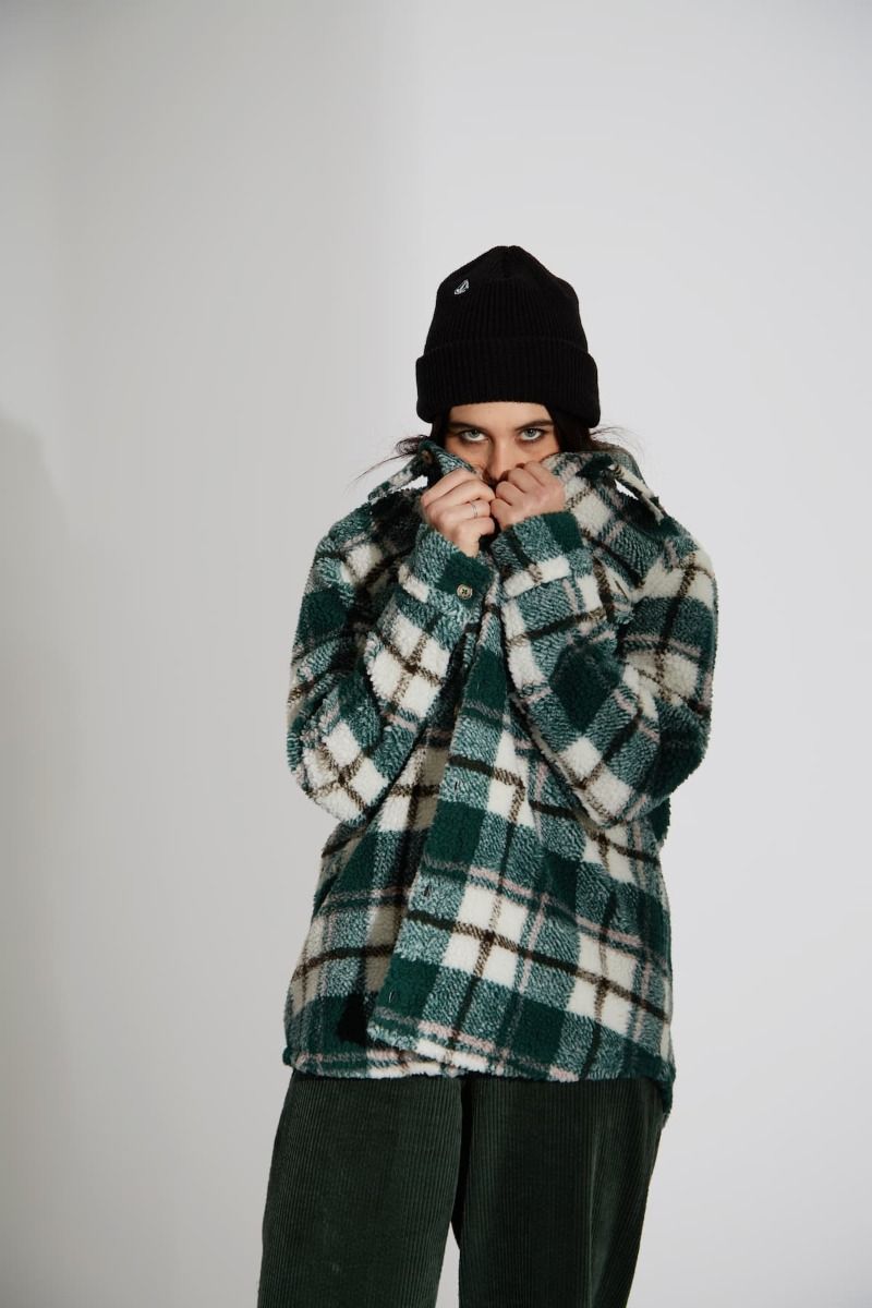 La sobrecamisa de tejido sherpa para mujer Silent Jacket en verde con estampado a cuadros (Dark Pine) de Volcom está confeccionada con 100% poliéster.