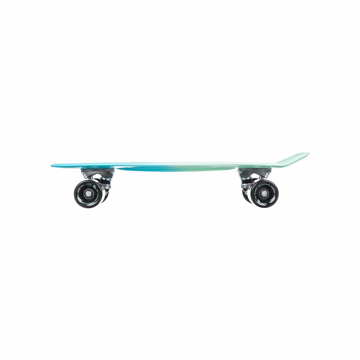 Este penny cuenta con deck de polipropileno en color azul y verde de 22.5" x 6.2", rodamientos ABEC 9 (608 2 RS), eje Kingpin Clásico de 3.25", ruedas moldeadas de poliuretano en color negro de 60mm y grip con patrón de agarre waffle.