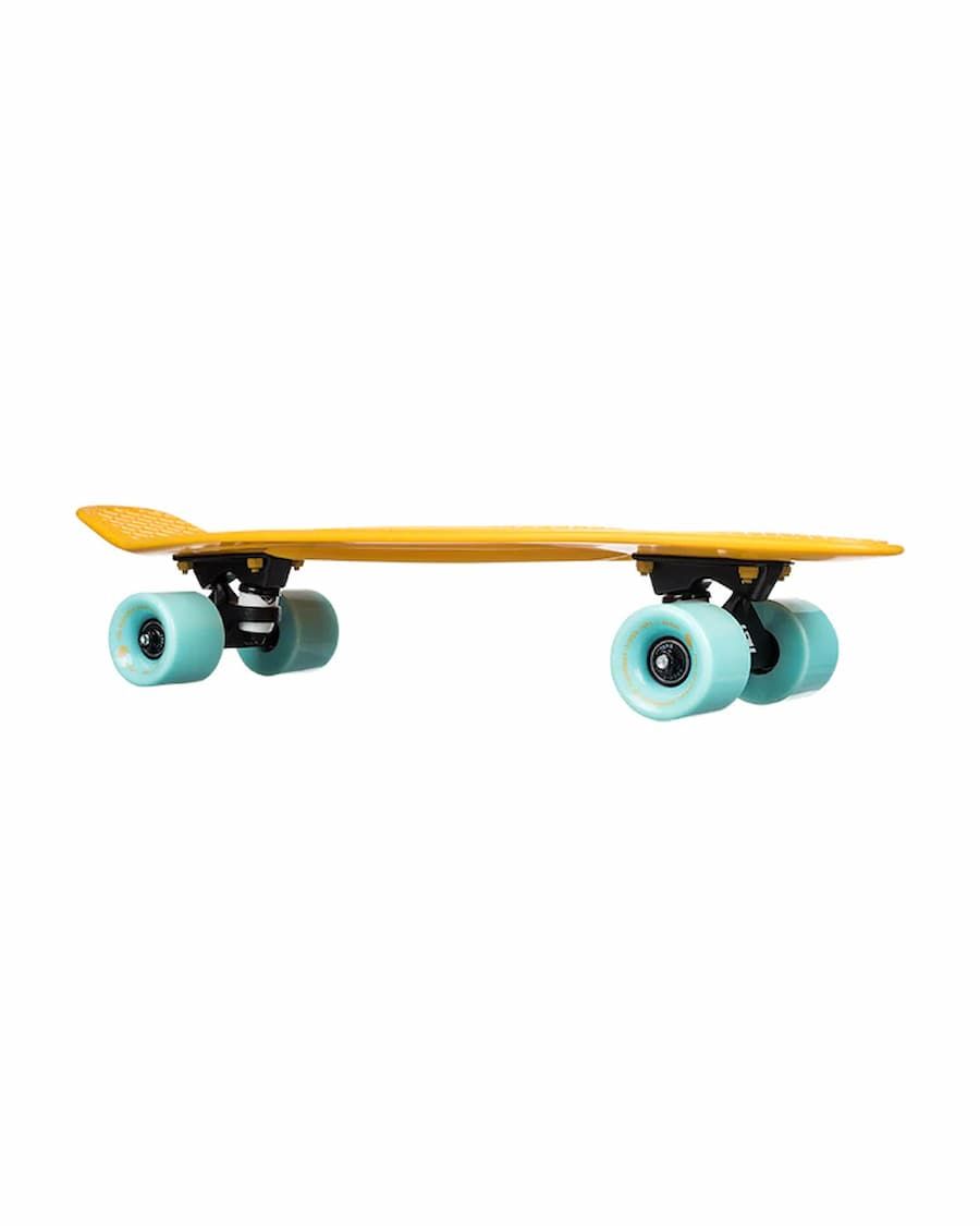 Este penny cuenta con deck de polipropileno en color amarillo de 22.5" x 6.2", rodamientos ABEC 9 (608 2 RS), eje Kingpin Clásico de 3.25", ruedas color aguamarina moldeadas de poliuretano de 60mm y grip con patrón de agarre waffle.