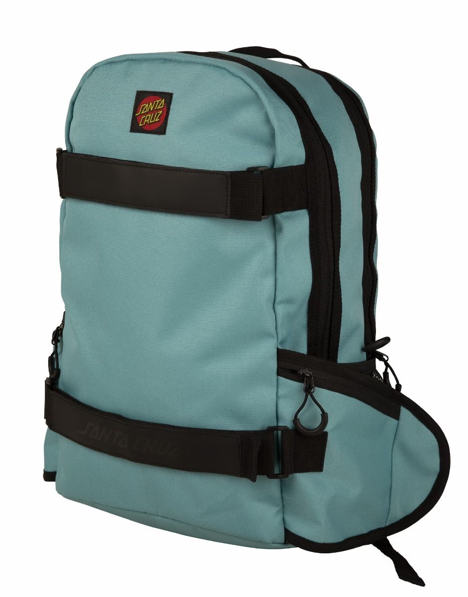 Esta práctica mochila de skateboard cuenta con correas para sujetar tu monopatín, un amplio compartimento principal, varios bolsillos organizadores, funda para el portátil, bolsillos laterales de malla, correas para los hombros ajustables, asa superior y un parche con el logo de Santa Cruz tejido en el frente