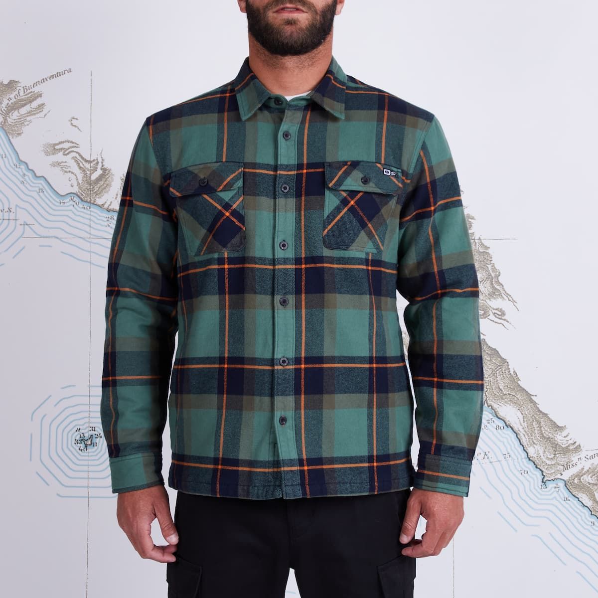 Esta chaqueta tipo camisa cuenta con forro de tafetán, tela a cuadros teñida en hilo, bolsillos laterales de tricot cepillado, dos bolsillos en el pecho con solapa y cierre de botón, cierre frontal de botones y una etiqueta de Salty Crew tejida en el lado izquierdo del pecho.