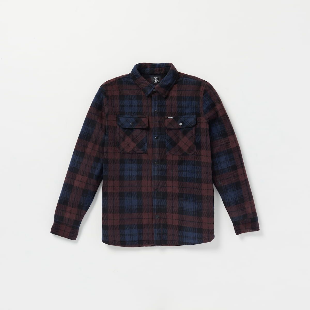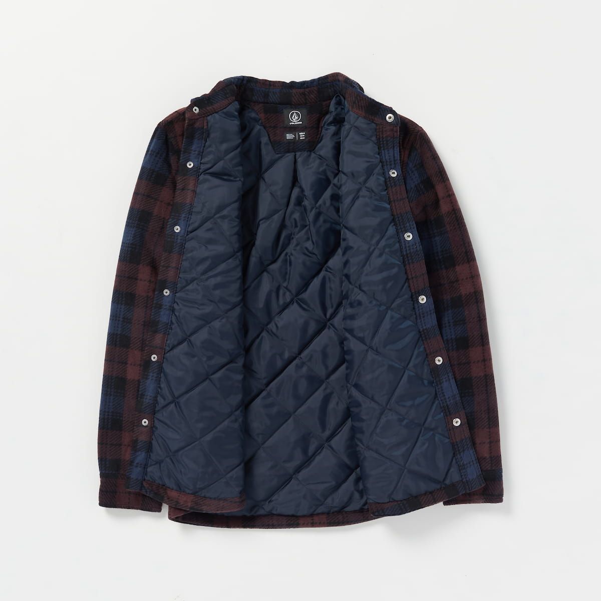 Esta cálida chaqueta tipo sobrecamisa granate cuenta con corte clásico y mangas largas para un ajuste cómodo, forro acolchado de tafetán para un extra de calidez sin perder ligereza, cierre delantero con botones a presión, embellecedores metálicos con el logo de Volcom, bolsillos en el pecho, bolsillo laterales y bordado Stone en la manga izquierda.
