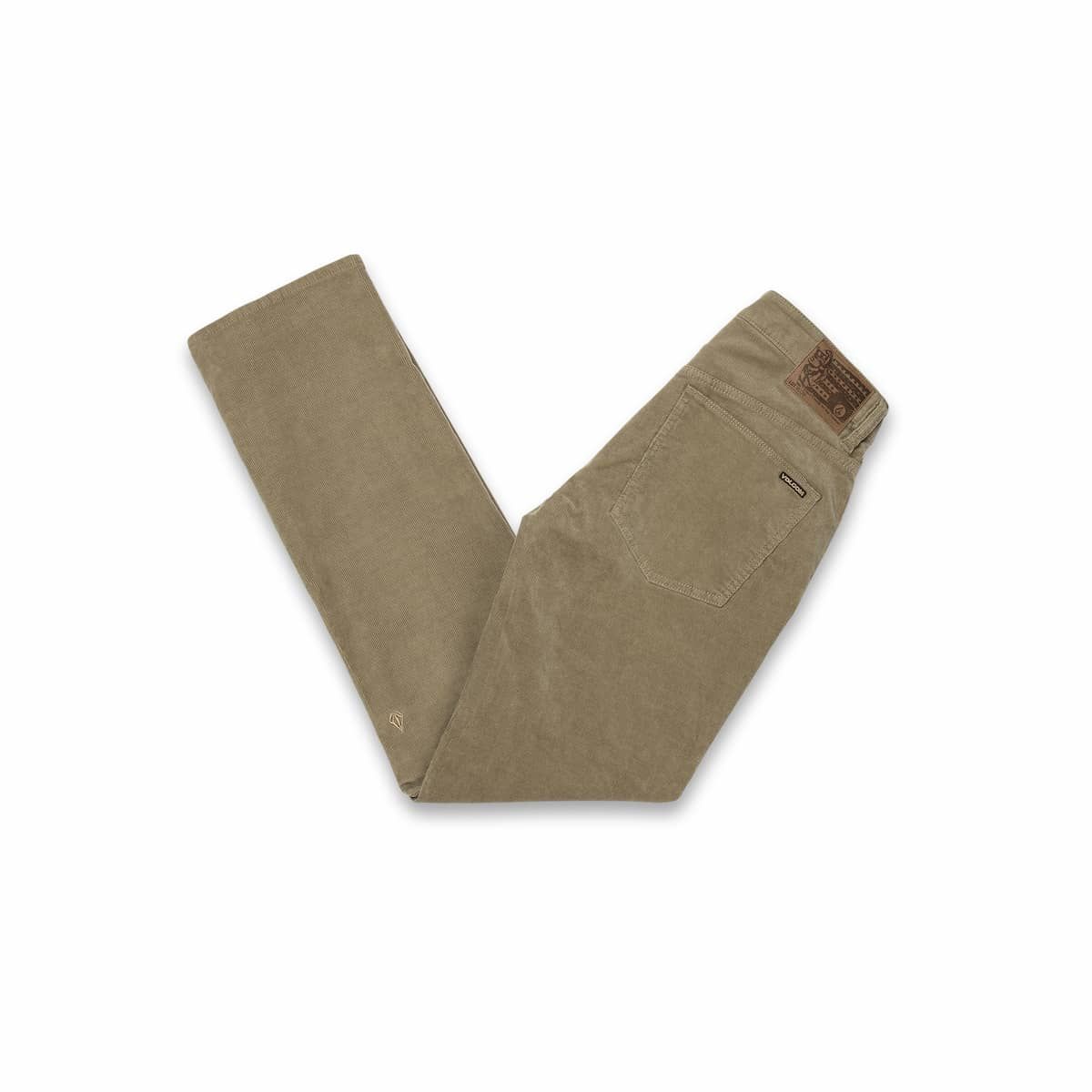 Los pantalones de pana Solver 5 Pocket Khaki para hombre tienen una etiqueta de garantía Volcom en la cintura interior.