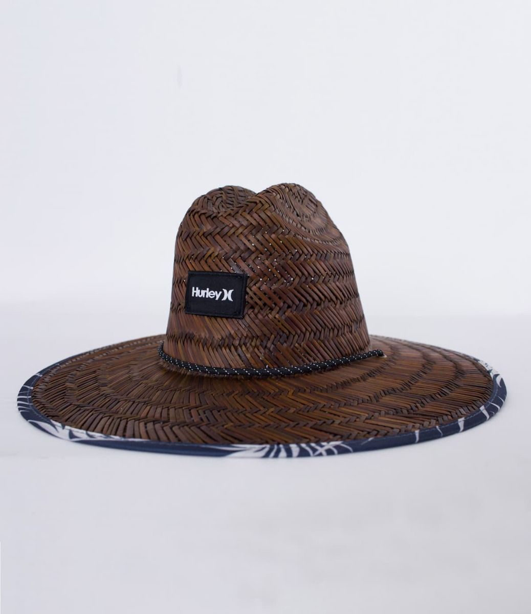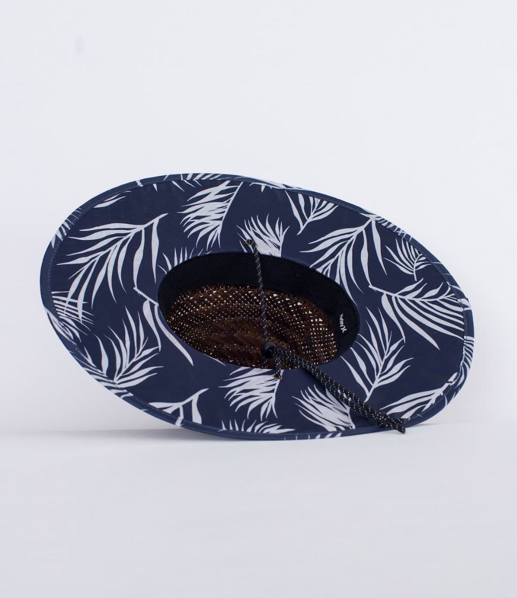 Este sombrero de playa cuenta con ala mediana, correa con clip ajustable a la barbilla, bordes y visera interna estampados y un parche Hurley tejido HD de damasco con borde fruncido en la parte delantera.