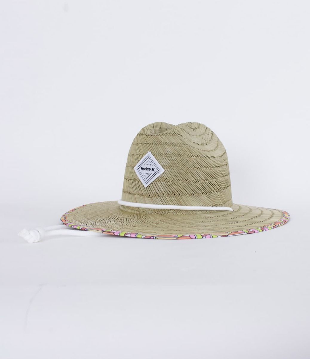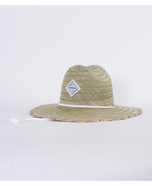 Este sombrero de playa cuenta con ala mediana, correa ajustable a la barbilla, bordes y visera interna con estampado multicolor y un parche Hurley tejido HD de damasco con borde fruncido en la parte delantera.