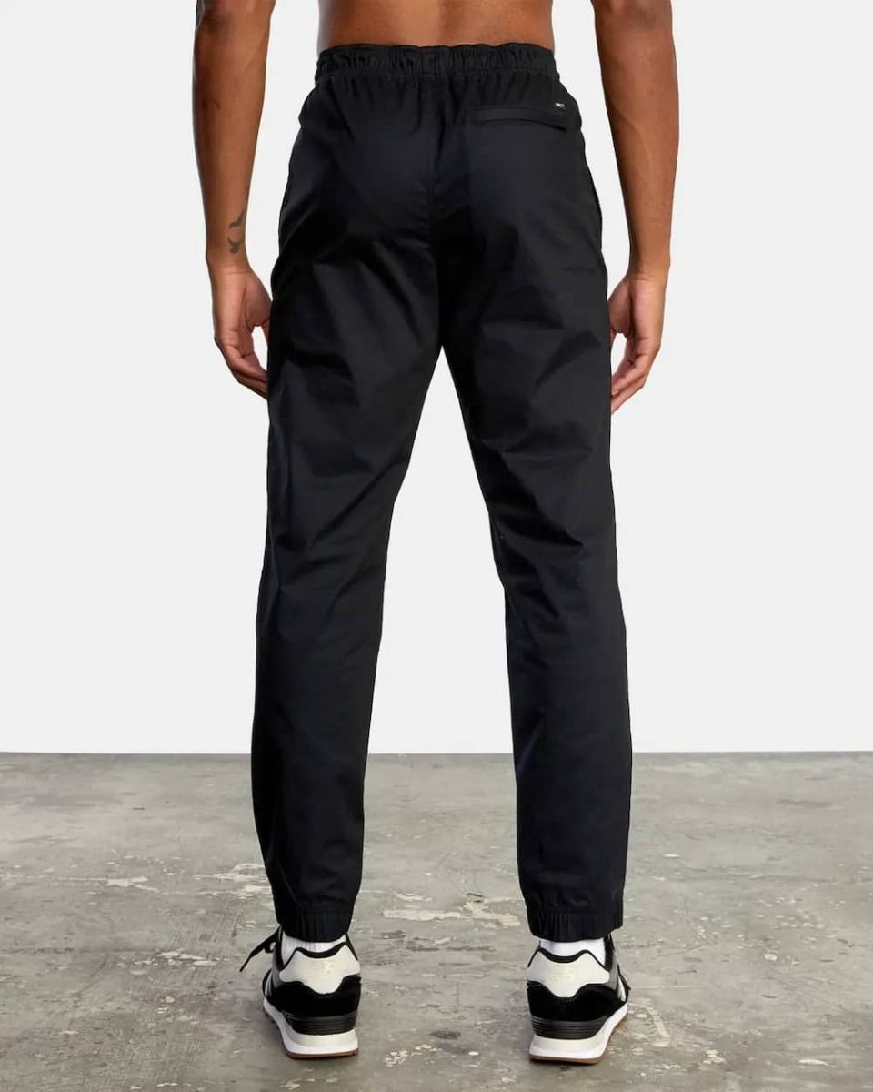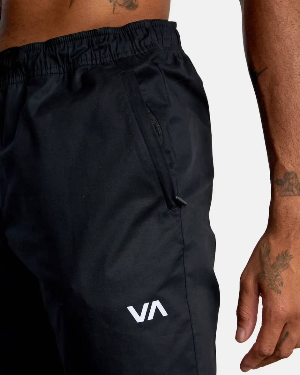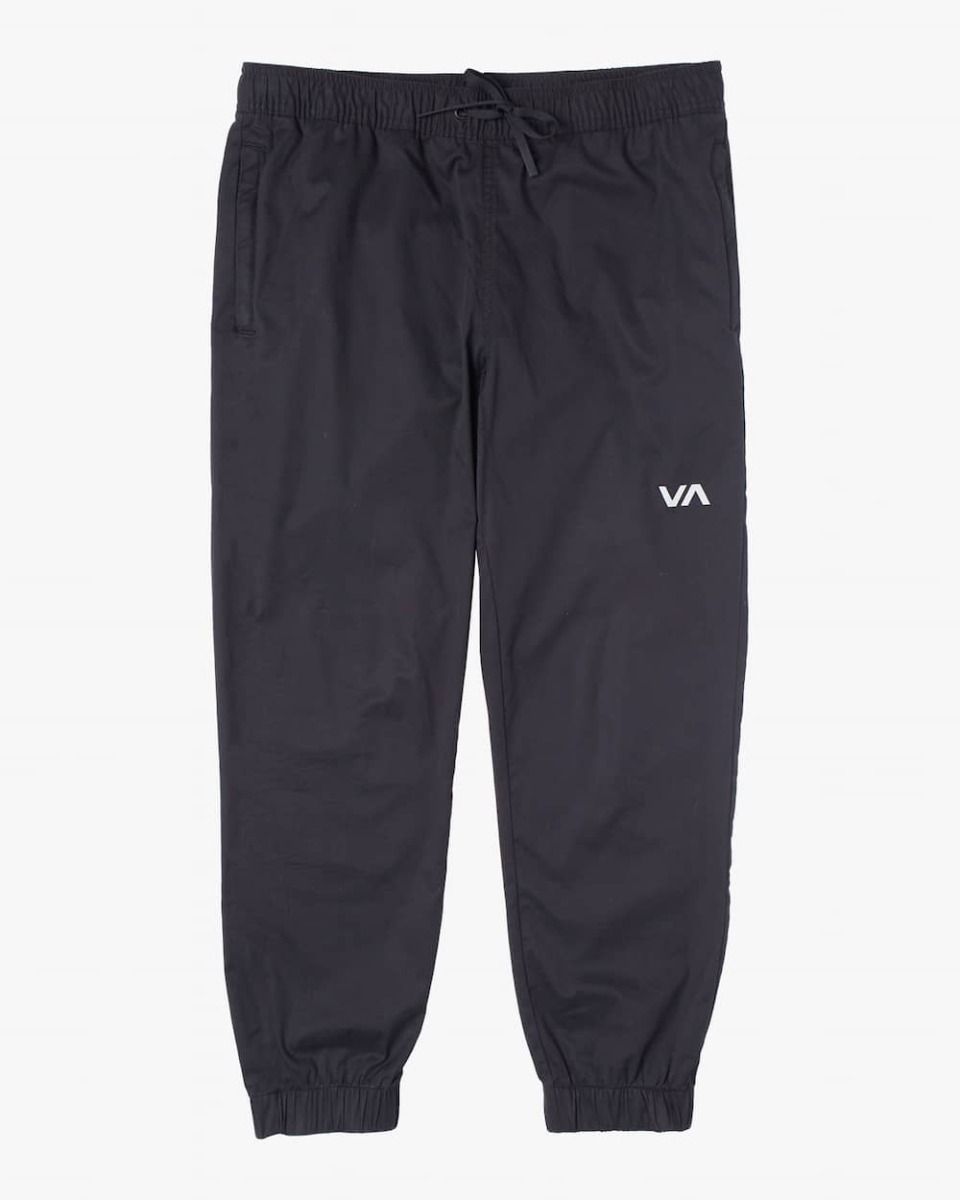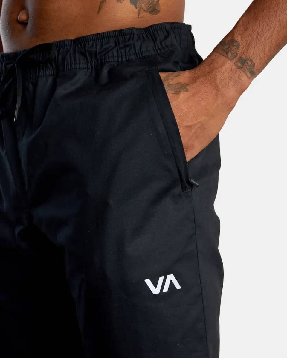 Estos pantalones de corte ajustado cuentan con cintura elástica ajustable mediante cordón técnico, dos bolsillos frontales de cremallera, bolsillo posterior de ojal con cremallera, puños elásticos, una etiqueta RVCA tejida sobre el bolsillo trasero y estampado serigrafiado VA en la pernera izquierda.