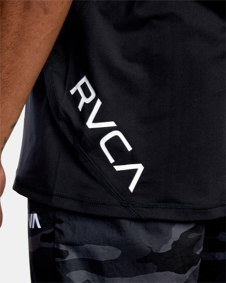 El top deportivo Sport Vent negro para hombre tiene una etiqueta de garantía Rvca cosida en el cuello interior.