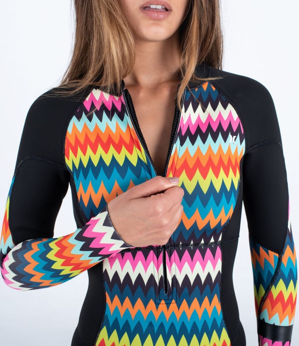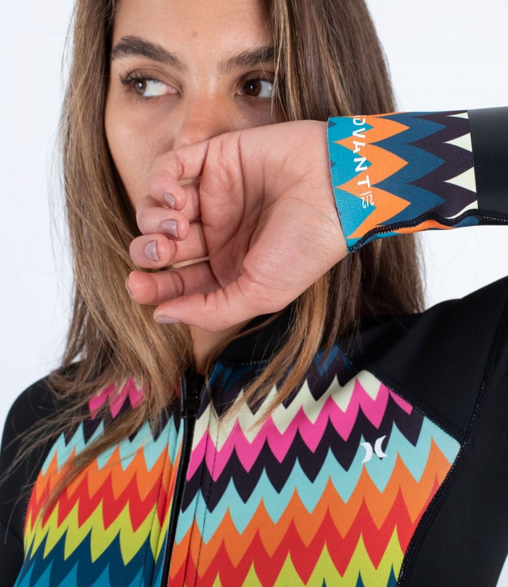 El traje de surf de primavera para mujer Women's Advant 2/2mm Springsuit en negro con estampado multicolor (Chevron) de Hurley está confeccionado a mano con neopreno Exoflex ligero y elástico, a partir de piedra caliza japonesa, y revestido con cinta elástica teñida mediante un proceso único de eficiencia energética y de agua.