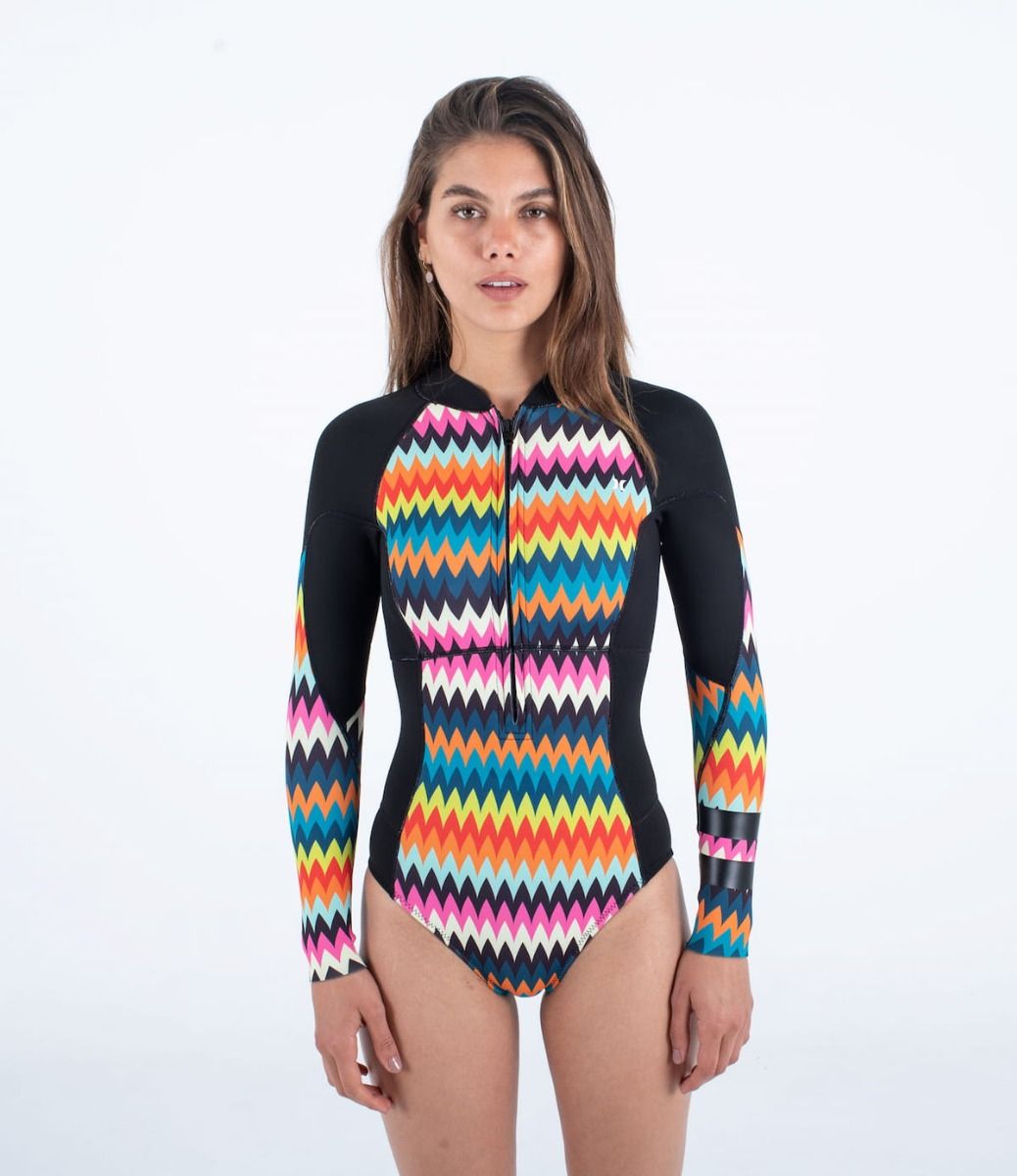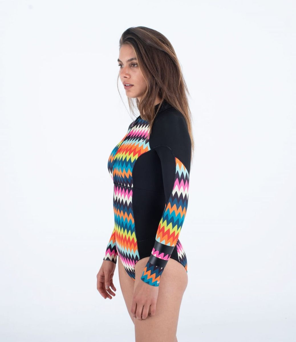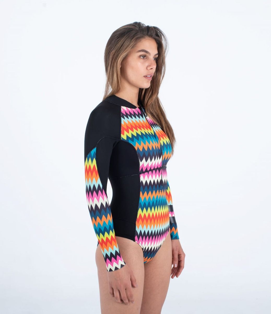 Este clásico neopreno Hurley para mujer de entretiempo cuenta con 2/2mm de grosor, ajuste normal, manga larga, cremallera frontal, cinta colocada estratégicamente para mayor durabilidad, estampado de colores, rayas Block Party negras en el brazo izquierdo y el icono de Hurley serigrafiado en la espalda y en lado izquierdo del pecho.