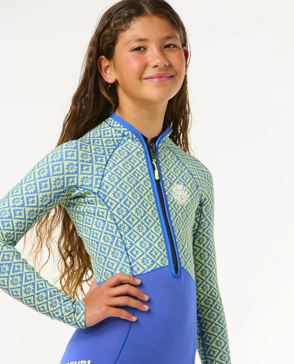 Con su original diseño bicolor, este neopreno corto transmite frescura, diversión y espíritu joven. La parte superior está compuesta por un estampado de figuras solares sobre fondo verde lima, mientras que la parte inferior en azul intenso resalta y equilibra visualmente el conjunto. El logo blanco de Rip Curl aparece serigrafiado en el pecho y en la pierna trasera, con un toque limpio y reconocible.