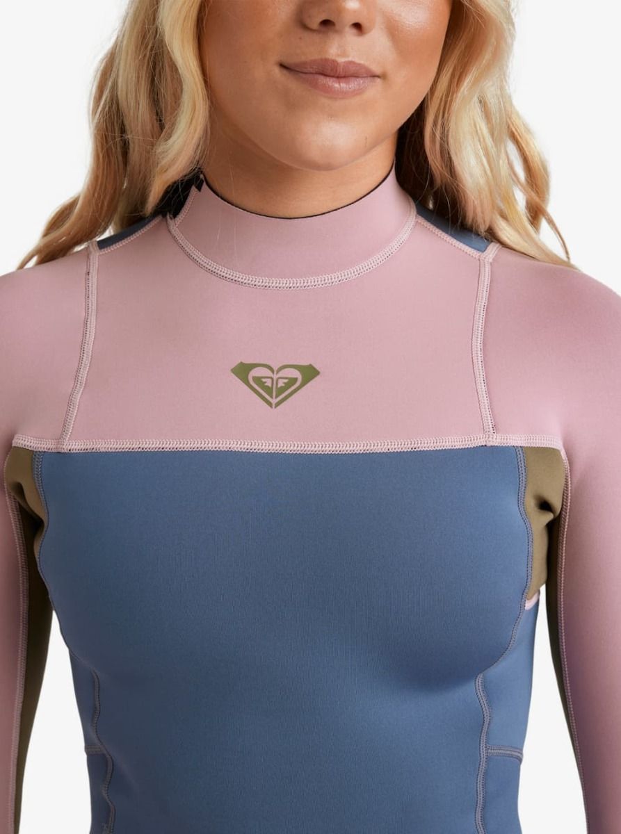 El color Ash, una combinación de gris azulado con mangas rosa empolvado y paneles oliva, aporta un toque técnico y elegante dentro del universo surf femenino de Roxy.