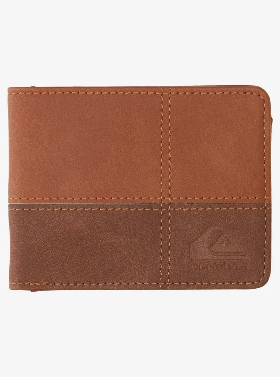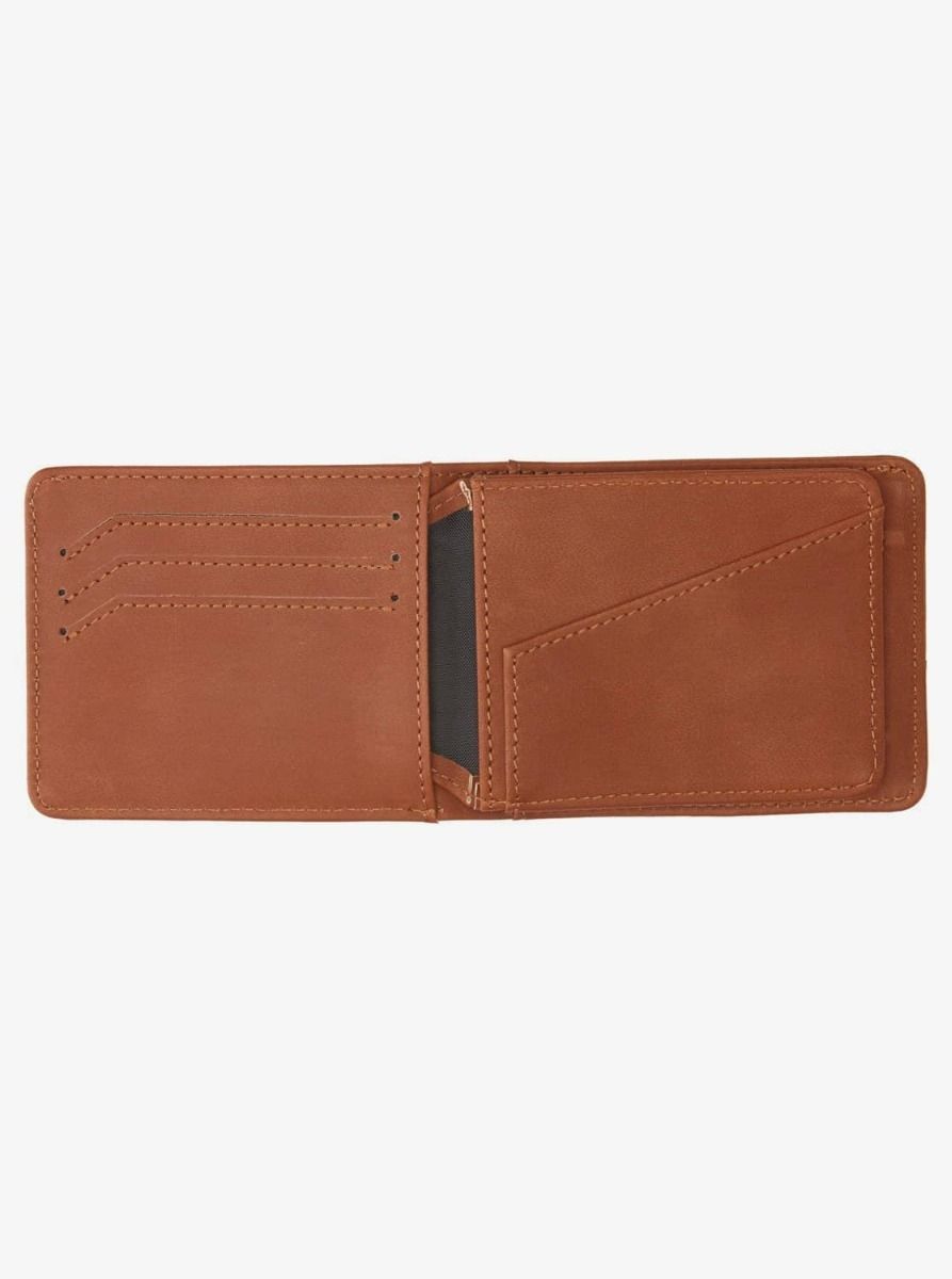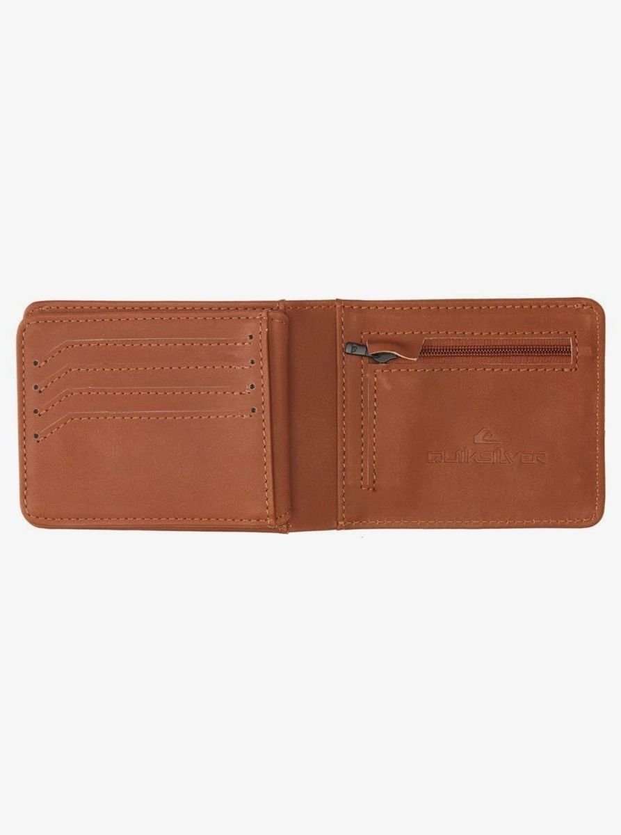 Esta cartera de triple pliegue cuenta con bolsillo para monedas con cremallera, ranuras interiores para tarjetas y el logo de Quiksilver grabado en relieve en la parte frontal y en el interior.