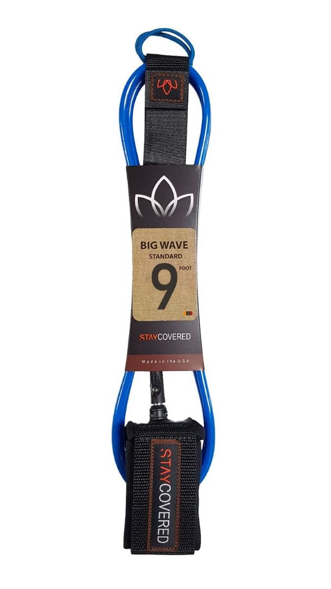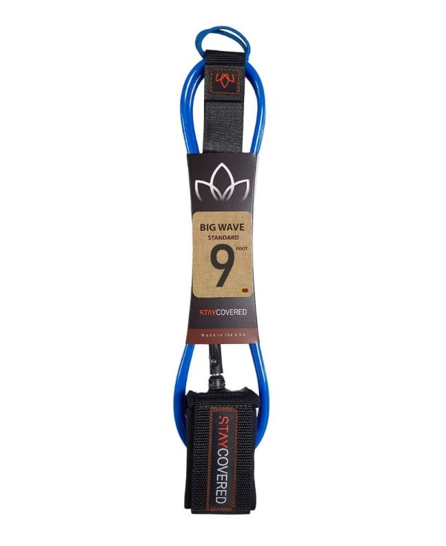 Este leash 9' de olas grandes color azul presenta correa de poliuretano extruido con 8mm de grosor, un puño más ancho, salva-cantos, a la vez que menos estiramiento y un agarre más fuerte que los leash de la gama estándar de Stay Covered.