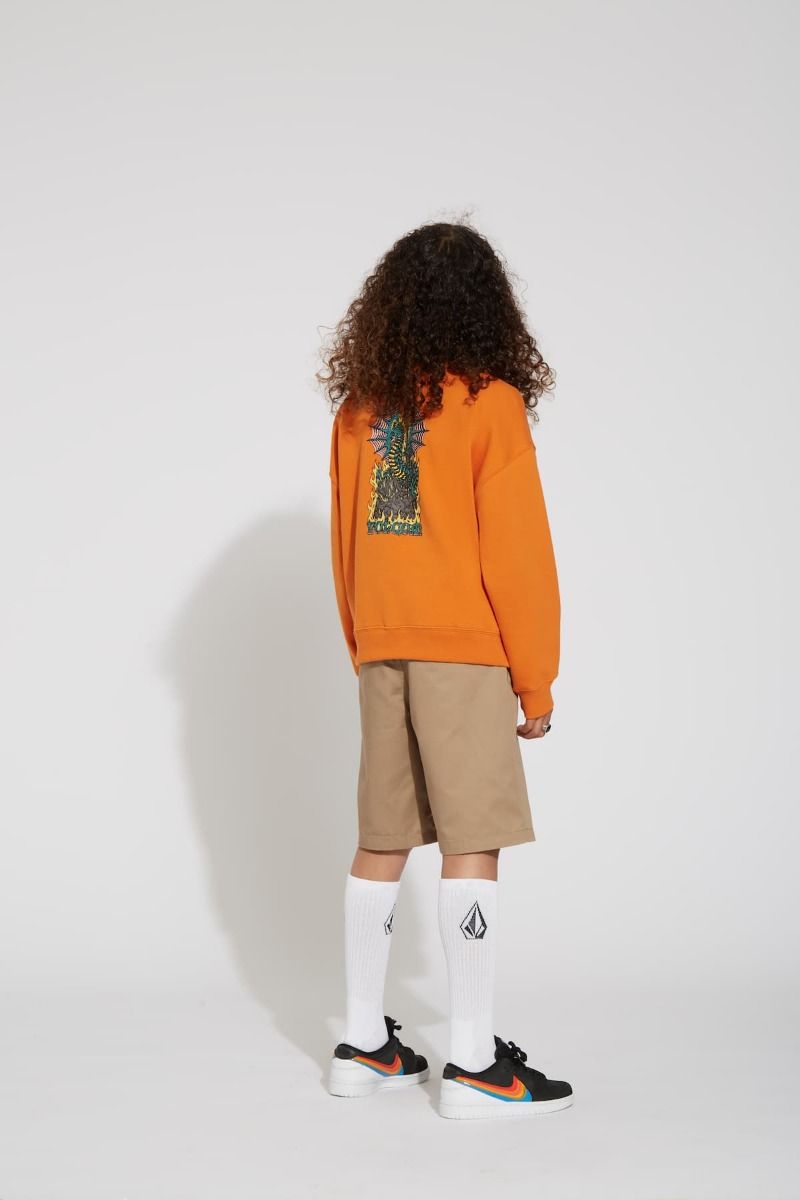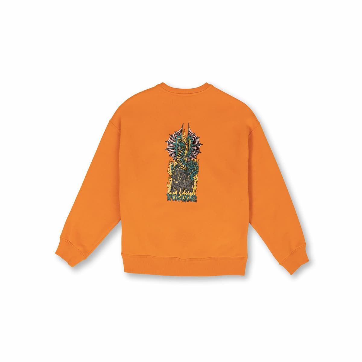 Este crew de corte loose cuenta con cuello redondo, punto canalé en puños y parte inferior, serigrafiado Volcom en el lado izquierdo del pecho, un estampado de una criatura y la Volcom Stone impreso en la espalda, junto con una etiqueta de la marca tejida en la costura lateral.