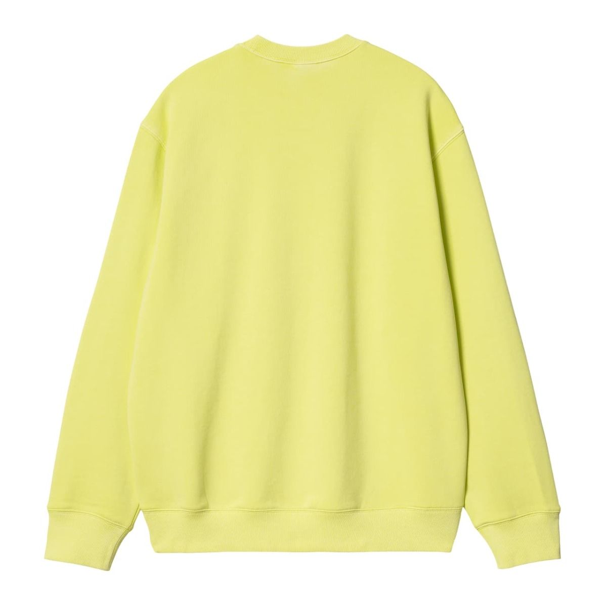 Esta sudadera básica color lima de ajuste holgado viene con tejido con tratamiento que le aporta una textura de bouclé, teñido con pigmentos para un tono saturado y lavado. También cuenta con cuello redondo, puños y cintura ribeteados y bordado tonal Carhartt en el lado izquierdo del pecho.