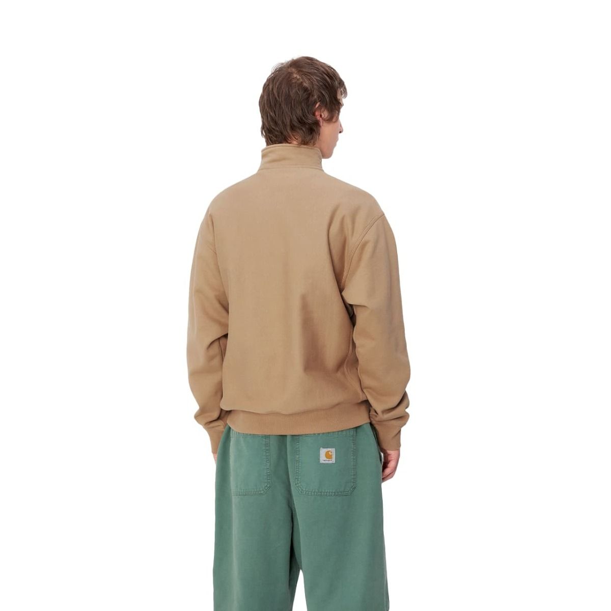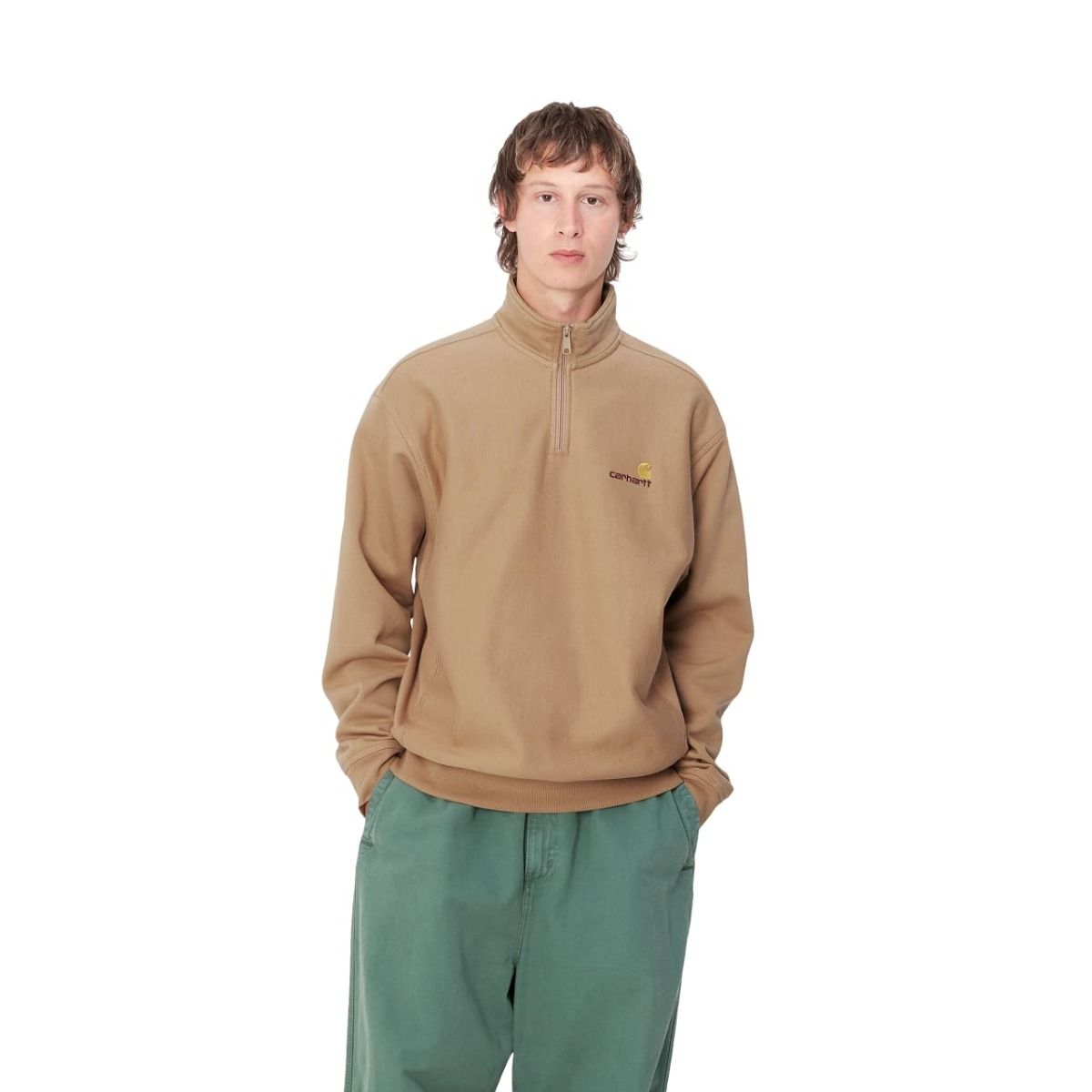 La sudadera con media cremallera para hombre Half Zip American Script Sweatshirt en tono marrón cacahuete (Peanut) de Carhartt WIP está fabricada con tejido en mezcla de 80% algodón y 20% poliéster (420g/sqm).