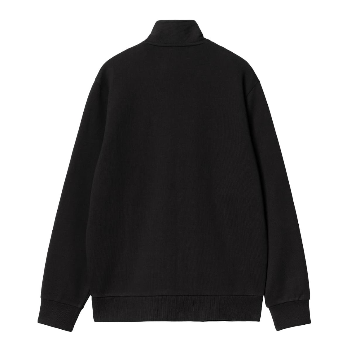 Esta sudadera negra con cierre delantero de cremallera tipo chaqueta cuenta con corte regular, puños y bajo acanalados, tejido cepillado para un acabado suave similar al forro polar, lavado en prenda para mayor suavidad, cuello alto, dos bolsillos ribeteados, junto con el logotipo en texto de Carhartt bordado en blanco en el lado izquierdo del pecho.