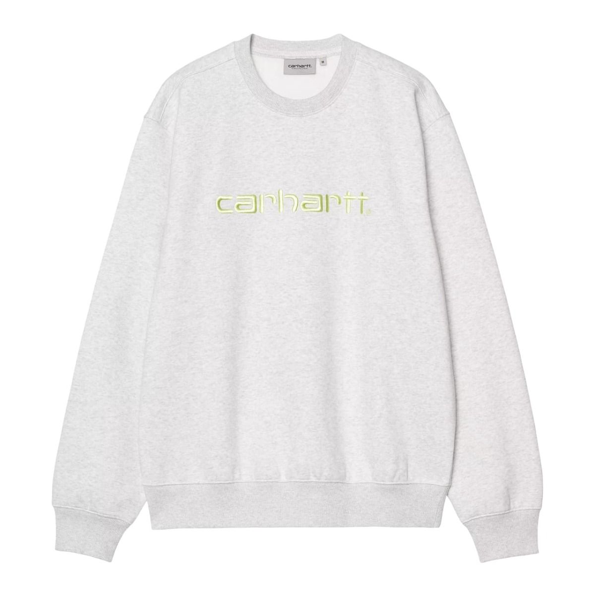 Esta cómoda sudadera básica en color gris ceniza jaspeado (Ash Heather) presenta ajuste holgado, tejido cepillado para proporcionar un aspecto de forro polar, cuello redondo, puños y cintura acanalados, junto con el logo de Carhartt en texto bordado en color verde aire (Air Green) en el pecho.