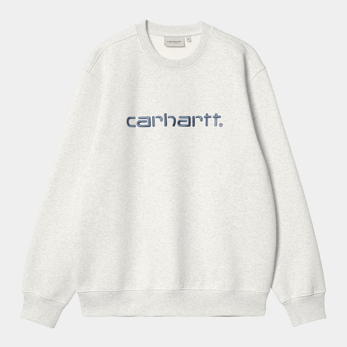 Esta cómoda sudadera sin capucha de ajuste holgado cuenta con tejido cepillado para proporcionar un aspecto de forro polar, cuello redondo, puños y cintura acanalados, junto con el logo de Carhartt en texto bordado en color azul en el pecho.